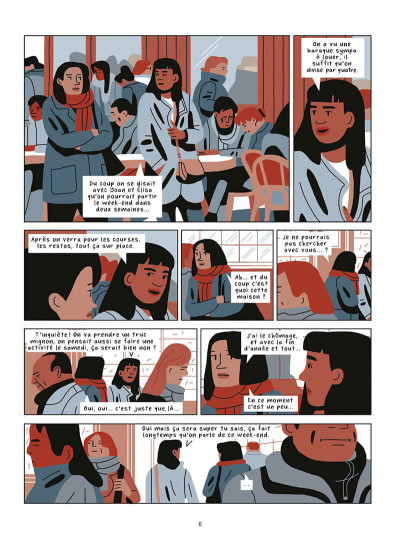 N’y aurait-il pas pu y avoir plus de nuance dans le sens de l’engagement, sur le rôle des politiques et de l’ensemble des parties prenantes? Et également, où sont les médias? C’est eux qui construisent l’imaginaire d’un mouvement. Il est juste évoqué que manifestant n’équivaut qu’à casseur. Cette idée ne vient pas de nulle part. Car si l’on poursuit la logique s’il y a 100 000 manifestants ce qui voudrait dire 100 000 casseurs, il n’y aurait pas qu’une trentaine de vitrine cassé, quelques feus de poubelles et quelques voitures abîmées. Le bilan serait beaucoup plus grave. Pourtant, on continue toujours d’assimiler les deux. Et si c’était vrai, à chaque fois qu’il y aurait des manifestations, il y aurait de la casse et ce n’est pas le cas non plus. Et il y a toujours des gens qui viennent en manif pour casser et il y a aussi des gens qui sont payés pour casser pour limiter l’impact d’un mouvement. « L’art de la guerre » n’est pas ouvrage récent et on sait comment manipuler les gens et les messages. Est-ce que c’était trop dangereux d’aller sur le terrain de la communication, de la sociologie et de l’anthropologie? Mais en restant juste sur un point de vue en surface, on se sent un peu frustrée. Par contre graphiquement, bien que les phylactères ne soient pas toujours lisibles car trop ton sur ton par rapport à la couleur du dessous, c’est très dynamique. On sent l’idée de foule, de masse, de partage, d’amitié, de générosité… On pourrait croire un ensemble cohérent et bienveillant qu’importe le message porté qu’il soit sur les migrant, les droits de la femme ou les violence policières. C’est un parti pris assumé et audacieux. Le sujet reste très peu abordé dans le 9e art à ma connaissance. De plus, ce n’est pas à travers le regard de journalistes de terrain, ni de militants investis et encore moins de la police. Un angle original qui vaut la peine d’être lu pour montrer qu’il est possible de parler d’un sujet à travers plusieurs regards. Où est la vraie vérité? Entre les bulles surement.