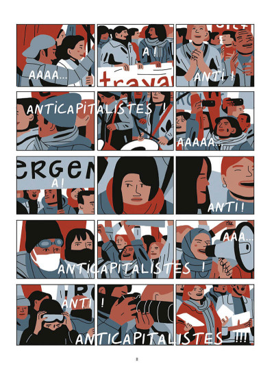 Anna est au chômage et doit faire face à une situation de précarité. Quand elle sort avec ces copines, elle ressent une sorte de fossé dont elle a du mal à expliquer. Un jour, elle regarde autrement une manifestation. Inconsciemment, elle s’introduit à l’intérieure d’une et noue rapidement un lien avec une inconnue. Bien qu’elles reçoivent une bombe lacrymogène, l’expérience en reste positive. La question « Et pourquoi le problème ça serait d’être en colère et pas de ne jamais l’être? « . A partir de là, elle s’engage de plus en plus. Et étonnamment, cela la rapproche de sa grand-mère elle aussi qui a lutté. Hélène Aldeguer ne propose pas vraiment une critique sociale. Mais plutôt une interrogation sur le rôle que chacun peut jouer pour exprimer son mécontentement et son action concrète dans un collectif. Est-ce qu’il faut accepter que l’on ne peut rien changer car les politiques font toujours ce qu’ils veulent? Mais si tout le monde pensait ça, ne serait-ce pas donner toute autorité à des dirigeants qui ont d’autres d’intérêts et enjeux que les citoyens de base? Qu’elle est la limite entre ce qui est acceptable ou pas? Le personnage survole ces sujets. Elle perçoit la notion de lien et de solidarité autrement. Les convictions restent très secondaires. Jusqu’où cela peut aller? Nous ne le saurons pas. La créatrice souligne la présence de la violence policière. Elle est aussi bien dans la stratégie pour casser les défilés, les limiter, les dissoudre. Pour y arriver, les représentants de la loi utilisent aussi bien les coups, les grenades de désencerclement, les flash-balls… L’ouvrage se termine avec une balle en caoutchouc dans l’oeil d’une manifestante et les slogans « Police assassins!! » raisonne. On sait qu’il y a eu de très nombreux blessés graves lors des manifestations des gilets jaunes dont la perte d’un oeil. Est-ce que la lutte se résume juste à cette dichotomie?
