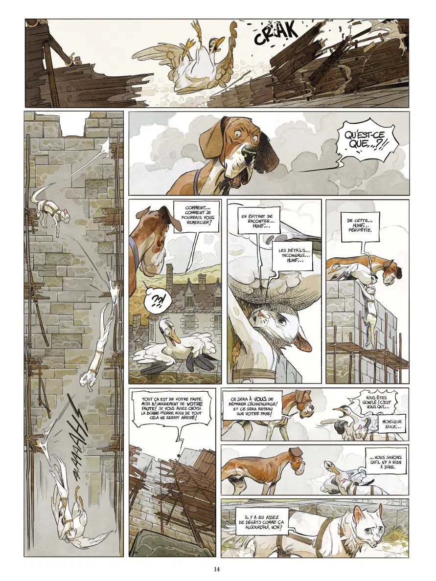 Quelque part dans la France de l’entre-deux guerres, niché au cœur d’une ferme oubliée des hommes, le Château des animaux est dirigé d’un sabot de fer par le président Silvio… Secondé par une milice de chiens, le taureau dictateur exploite les autres animaux, tous contraints à des travaux de peine épuisants pour le bien de la communauté… Miss Bengalore, chatte craintive qui ne cherche qu’à protéger ses deux petits, et César, un lapin gigolo, vont s’allier au sage et mystérieux Azélar, un rat à lunettes pour prôner la résistance à l’injustice, la lutte contre les crocs et les griffes par la désobéissance et le rire… Premier tome d’une série prévue en quatre volumes, Le Château des animaux revisite La Ferme des animaux de George Orwell (1945) et nous invite à une multitude de réflexions parfois très actuelles…