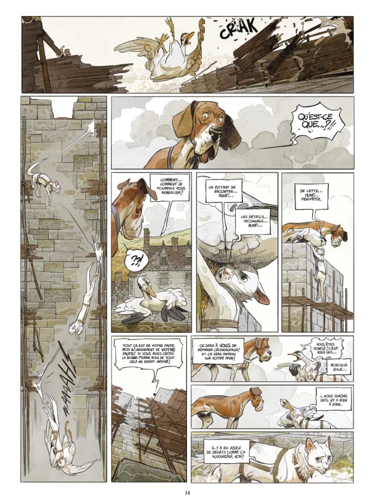 Les humains ont quitté le château et les animaux reprennent le contrôle du lieu. Mais est-ce que c’est mieux? Le président Silvio et sa garde canine font régner la terreur. Et quand certains essaient de souligner l’injustice et l’inégalité de traitement, ils finissent morts. Y a t’il une autre façon de faire douter de la dictature? Un rat artiste de passage vient révéler une évidence et donne une réponse. Inciter le changement ne passe pas forcément dans le rapport de force. M. Bengalore et César vont expérimenter pour montrer la force de l’humour et du doute. Xavier Dorison met encore sa capacité de scénariste au service d’une histoire indémodable avec « La ferme des animaux » de Georges Orwell. Un livre pour enfant qui cache une critique sévère de bien des gouvernements du passé et encore d’actualité. Le scénariste en parle avec beaucoup d’éloquence en prologue. Pour donner un nouvel élan à ce texte, il prend la forme d’une série en bande dessinée. Décrire le mécanisme de la tyrannie est toujours d’actualité et le système ne connaît pas la crise. Il faut impérativement mettre de côté la haine et surtout le mépris et l’indifférence. Le chemin sera rempli d’embûches de taille et il prendra du temps. Mais c’est la seule façon de convaincre et de façon pérenne. L’anthropomorphisme comme les fable de la Fontaine est une façon de faire comprendre facilement les choses. Félix Delep propose un univers graphique vraiment incroyable. C’est précis, riche, dynamique… Il ne néglige jamais les ambiances assez tendue avec parfois un brin d’espoir. Le premier tome pose le cadre et donne indéniablement envie d’aller plus loin. On sait que nos cellules grises vont travailler et faire des parallèles.