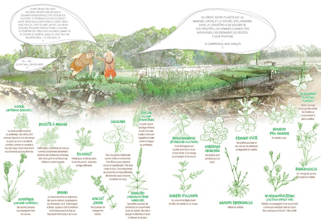 Min-ho Choi poursuit son récit des rebondissements dans la gestion de son jardin. Il est encore un néophyte et ne connaît pas toutes les subtilités d’entretien, de protection, de conservation… Heureusement que ces voisins savent lui donner des conseils et lui transmettent leurs expériences. Chaque jour lui réserve son lot de surprises. Pas le temps de s’ennuyer car les saisons réserves leurs lots de stupéfactions. Rien de tel pour expliquer aux lecteurs ses découvertes. Il en profite pour les sensibiliser à un sujet qui lui tient à cœur apparemment. Il aborde la problématique des semences en dessin et aussi avec des interviews en fin d’ouvrage. Le mangaka se rend compte que les graines qu’il sème viennent majoritairement de l’étranger. La Corée ne produit plus grand chose. Et beaucoup de ces graines ne permettent pas de faire des plantes stériles. Par conséquent, il faut enrichir chaque année des multinationales qui contrôlent toute la chaîne jusqu’aux lois internationales. Quel rôle joue alors la personne au bout de la chaîne? Peut-elle vraiment concevoir une vraie culture dans le respect de la biodiversité si l’ingrédient de base est modifié? Vous ne trouverez pas une histoire continue. Juste des impressions et des constats dans des petits chapitres. Il évoque la grossesse de son épouse, son travail de dessinateur, son beau-père… On apprécie les dessins en aquarelle d’une grande douceur et légèreté. Même si on ne s’intéresse pas à l’aspect qui rappelle « Rustica », on se fait plaisir aux yeux. On peut juste développer notre façon de voir sur le jardinage. Faire son jardin n’a rien de facile et d’évident.