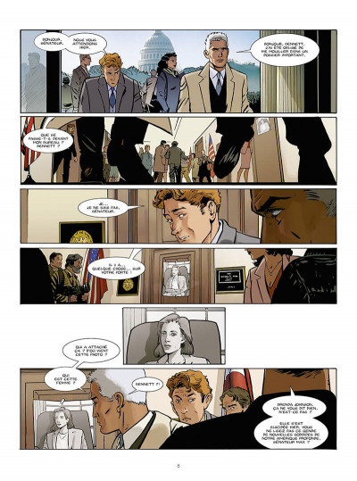 Larry B. Max veut faire de son mieux à son poste de sénateur. Toutefois, il s’est fait piéger en couchant avec une femme qui n’est pas son épouse. Ecouter son pénis n’incite pas forcément à faire les bons choix. Le voilà maintenant obligé de suivre les consignes d’un groupe de financiers. Le chantage pousse les gens à faire et de dire des choses qu’ils ne pensent pas. Il doit s’allier avec un de ces ennemis qui a aussi trempé son biscuit où il ne faut pas. Dur dur la vie des politiques qui doivent évacuer leur stress d’une façon ou d’une autre. Une fiction tellement proche de la réalité. Desberg propose des aventures en incluant toujours une part de réalisme et une critique de la société. Pour ce nouveau cycle se nommant Criminalité climatique, il s’intéresse à un sujet très moderne avec le réchauffement climatique et les enjeux financiers qui se cachent derrière. Le scénariste utilise une stratégie bien connue des lobbys en se faisant passer pour une ONG, ici une de protection de l’environnement. Elle veut attirer de l’argent d’investisseurs souhaitant un bon retour de bénéfices.