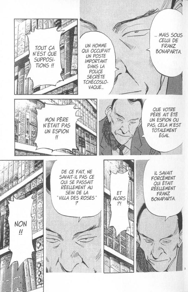 Tenma s’est enfui pour sauver Eva. Mina cherche désespérément ces souvenirs. Et Johann rend hommage à sa mère de façon assez singulière. Naoki Urasawa s’attarde un peu plus sur les femmes dans ce tome. Mina cherche dans sa mémoire ce qui a pu se passer à la villa des roses et avec son frère jumeau. Mais ce qui remonte n’est guère glorieux. D’ailleurs tout ce qui a attrait à ce lieu ne cache que de sombres secrets. Est-ce la découverte d’ossements dans le jardin va changer quelque chose? On en doute assurément. Toutefois n’est-ce pas le signe qu’il faut passer à quelque chose d’autres? Que va t’il en être de notre sociopathe préféré? Ruge tient à avoir plus d’informations sur l’auteur des contes pour enfants assez horrible. Pourquoi un tel acharnement? On retrouve Eva qui est protégée par un homme très pragmatique. Cela ne suffira pas à l’empêcher à prendre des balles dans le corps. Pourra t’il arriver assez vite aux côtés de Tenma pour qu’il donne des informations et survivre? Que vient faire ce personnage d’un coup dans le récit? Le mangaka ne laisse jamais rien au hasard et sans raison. La psychologie des acteurs est toujours assez finement amené. Personne n’agit sans une bonne raison. Et on travaille notre empathie avec tous car on s’attache à eux grâce à leurs faiblesses sans omettre leur force. Dans 4 tomes tout sera terminé et on a vraiment hâte d’en arriver là pour tout comprendre et prendre une claque scénaristique.