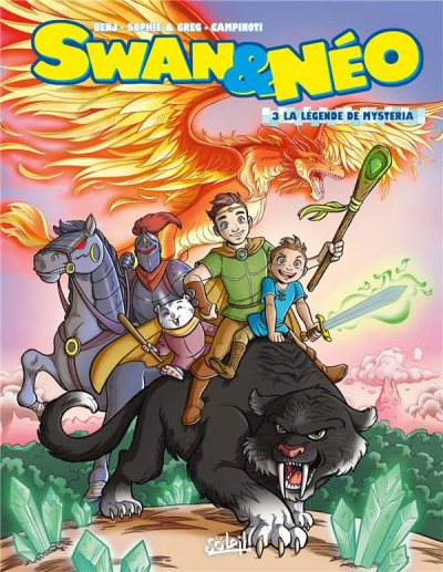 Le succès des youtubeurs ne connaît pas la crise. Les produits dérivés tels que le magazine, le jeu de société, le mug magique, le calendrier rencontrent toujours leur public. Donc quoi de plus normal de retrouver Swan & Néo dans un troisième album. A nouveau, ils vont être projeter dans un jeu où il faut s’en sortir vivant. Sans surprise, les deux adolescents s’en sorte haut la main. Il y a des références pour tous les âges et toutes les cultures. Que l’on soit fan du mythe arthurien ou soit de l’univers de Tolkien, vous trouverez votre petit bonheur. Une épée dans un cailloux, des elfes avec des oreilles pointues.. sans oublié quand même des clins d’oeil aux personnages de la série comme la gerbille, vous aurez du choix. On n’a pas le temps de s’ennuyer car les scènes d’action se succèdent les unes après les autres. L’ennui n’est pas de la partie. Benj, Sophie & Greg avec la collaboration des frangins arrivent à renouveler son lot de rebondissements pour cueillir le jeune lecteur. Paolo Campinoti, au dessin et Alessandro Russotto, à la couleur restent fidèles aux tomes précédents. Un graphisme classique pour la bd jeunesse tout en rondeur ainsi que des couleurs alternant entre sombre et très joyeux selon les circonstances. Les fans seront contents et aucun doute qu’ils attendront avec impatience la suite.