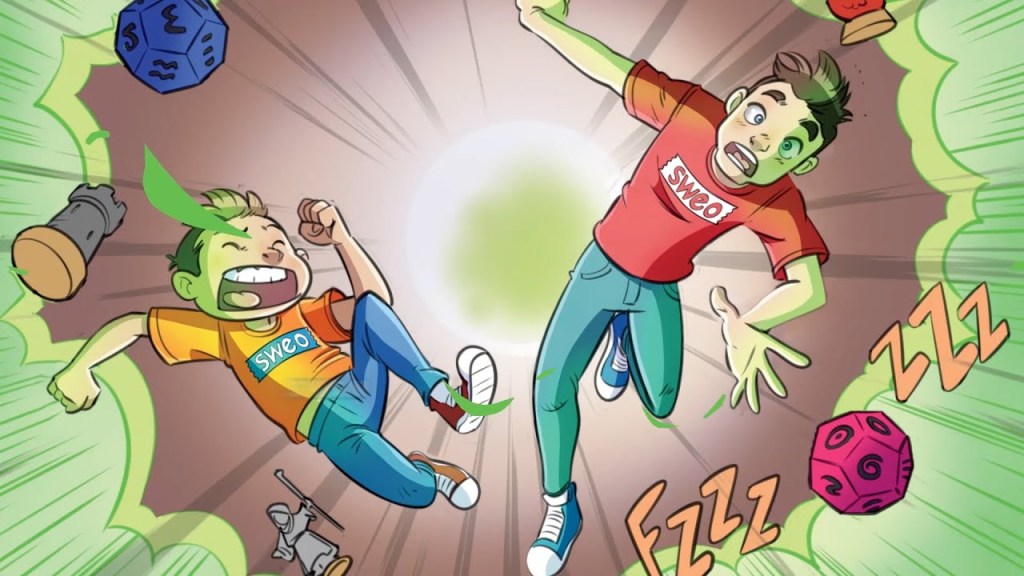 Impossible de rester tranquille quand Swan et Néo jouent à la console. Pour gagner, tous les coups bas sont autorisés comme balancer le chat ou la gerbille. Malheureusement quand ils deviennent trop bruyants les parents s’alertent. « Vous avez fini vos devoirs pour demain? ». Par conséquent, ils doivent aller dans leur chambre avec leur sac d’école. Qu’il est difficile de se concentrer. Est-ce le frangin qui fait exprès du bruit pour nuire à la concentration? Mais le bruit vient du grenier. Pour avoir la réponse, il faut prendre son courage à deux mains. Munis d’une batte de baseball et d’un pistolet à eau, ils montent les marches. Heureusement que le coupable n’était d’autre que leur compagnon à quatre pattes Nuts. Pris en flagrant délit de gourmandise, il bondit en faisant tomber un jeu, le royaume Mysteria. Les frères ne le connaissaient pas et c’est suffisant pour piquer leur curiosité. Ils installent le plateau et lancent les dés. Soudainement les voilà emportés dans un autre univers. Pas trop le temps de réfléchir car des harcehäters tentent de les tuer. Par chance, lord Galahan arrive sur son cheval pour les sauver. Il les ramène en un lieu sûr, la forteresse de Ham’Castle. A partir de là, leur vie prend un nouveau tournant car le poids de la liberté d’une nation va peser sur leurs épaules. Vont-ils arriver à relever le défi?