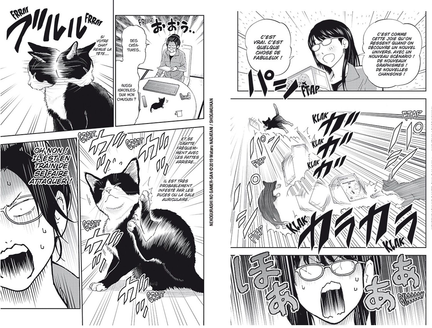 Wataru Nadatani a trouvé deux éléments tendance. Nous avons d’un côté les jeux vidéos avec une gameuse et de l’autre un jeune félin qui a besoin d’amour. Les deux réunis ne peuvent que donner des aventures amusantes et attachantes. Kozakuza fait son boulot dans les temps afin de rentrer chez elle pour jouer en réseau. Chaque jour, c’est son plus grand plaisir. Jusqu’au moment où au travail, elle accepte ponctuelle d’adopté un chaton. D’un regard, c’est le coup de foudre. Elle ramène la boule de poil à son domicile. L’un doit s’adapter à l’autre. Le charme opère aussitôt. Les rebondissements ne manquent jamais surtout quand on voit la découverte du monde par les deux nouveaux meilleurs amis. L’une adore le contenu de la boîte et l’autre est ravi du carton ainsi que des papiers de protection. Ou encore, l’animal s’amuse à bondir sur ces mains pendant qu’elle joue. Un grand moment de partage et d’adaptation. C’est charmant et attendrissant. La lecture permet une vraie détente et de sourire. Comment résister aux regards pleins de tendresse d’un petit chat ? Les fans de minous risquent d’être enchanté.