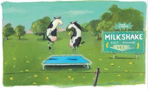 Après « Bonne journée », « Bonne continuation », Olivier Tallec poursuit la réalisation des albums avec « Je reviens vers vous ». Des titres qui font références à des messages qu’on laisse en bas des cartes ou des mails. C’est assez amusant car beaucoup des illustrations des ouvrages se trouvent en carte postale. Par conséquent, en l’envoyant, il vous est possible de faire un clin d’oeil au livre, même inconsciemment. L’illustrateur maîtrise avec grand art aussi bien le graphisme que l’art des mots. On se rince les rétines de ces dessins très bien réalisées et surtout de ce qu’ils racontent. Comment ne pas sourire de voir des vaches sauter sur un trampoline avec des bananes pour faire un milk-shake parfumé? L’anthropomorphisme est de mise. Il est plus facile de critiquer l’humain sous couvert des animaux, de mythes ou de contes. Le sens de la dérision et de l’absurde sont très bien maîtrisés. Le commentaire ou le dialogue sous l’image fait toujours mouche. On rit, on sourit, on pouffe… Ce n’est pas donné à tout le monde d’arriver à toucher les gens aussi directement. L’humour prime devant tout et l’efficacité est au rendez-vous. Le format paysage permet de vraiment en profiter totalement et facile le confort de lecture.
