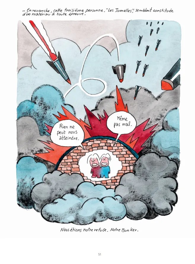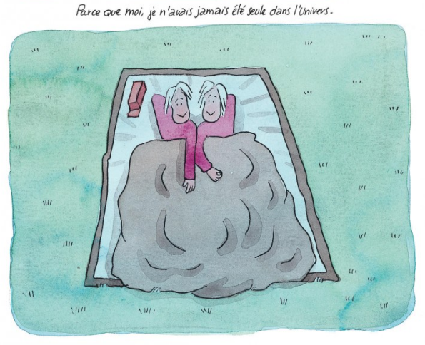 En un coup d’oeil, on reconnaît le dessin patatoïde de Florence Dupré La Tour. Après des récits autobiographiques très amusants avec « Cruelle » et « Pucelle », elle revient pour partager des souvenirs très personnels. Pour continuer dans cette inspiration, elle va aussi aller piocher avec aisance dans ceux de sa soeur jumelle, Bénédicte. Vous comprenez dorénavant mieux le titre qui d’ailleurs n’a pas de lettre s. Ce n’est pas parce qu’elles sont deux qu’elle forme un être unique. C’est une quête de sens sur son identité et sa relation à l’autre, qui est un peu soi. Leur gémellité est à la fois une force et une faiblesse. Elle souligne aussi le jeu avec des limites liées au cadre religieux très puritain. Dans un style faussement enfantin, la créatrice se dévoile avec authenticité, humour et dérision. Aucun tabou n’est à déplorer car tous les gamins passent par des phases de doutes et d’expérimentations. Des choses que la plupart ont pu oublier ou gardent secret. Elle y pose des couleurs assez douces et rassurantes pour souligner des réminiscences. Un ensemble cohérent qui se dévore assez rapidement.