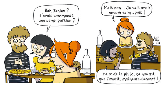 Au lycée, pour tenter d’aiguiser l’esprit critique des adolescents en mal d’hormones, les professeurs tentent d’inculquer des concepts de philosophie. Pour la plupart des élèves, c’est une sinécure à réfléchir avec ces références à des hommes d’un autre temps comme Platon. Janine, professeure et doctoresse en philosophie, est une véritable passionnée de sa matière de prédilection donc créer un outil de médiation semble à propos. Elle a décidé de mettre en image des questions existentielles sous un angle un peu singulier. Nous allons réaliser des balades autour des thématiques du goût, la durée, la nature, le solipsisme, l’empathie… L’approche est des plus humoristiques. Elle se met en scène et dans sa vie au quotidien débarquent des philosophes quand elle est aux toilettes, entrain de lire un roman ou toute nue dans sa baignoire. Les échanges sont des plus provoquants, piquants, absurdes, percutants et intelligents. Le monde qui nous entoure est rempli d’interrogations pour celui qui veut se donner la peine de les voir. Grâce à cette bande dessinée des plus étonnantes vous aurez envie de pousser plus loin votre regard pour lire entre les mots.