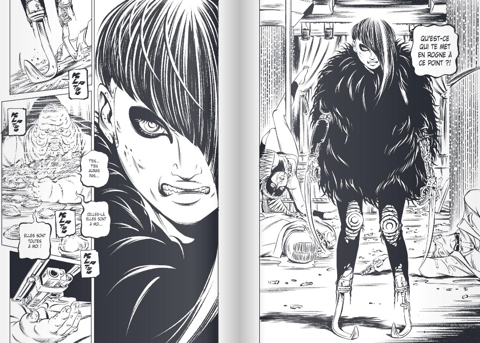 Atsushi Kaneko a décidé de relever un défi de taille. Redonner un petit coup de jeune à « Dororo » d’Osamu Tezuka. Le grand maître inspire toujours les mangakas de tout temps. N’ayant pas lu l’oeuvre originale, c’est difficile de comparer et donner un avis. Par conséquent, on va se consacrer uniquement à la série actuelle. Quand on voit la couverture, il y a quelque chose d’attirant et de rebutant à la fois. La structure avec un titre en biais qui rapetisse en partant de gauche à droite et en fluo évoque le cinéma par exemple. Ce choix nuit à la lisibilité du titre. Après la lecture, on constate que toute l’histoire est racontée sur cet espace pour intriguer l’oeil. Il faut un peu de temps pour rentrer dans le récit car les débuts sont laborieux, lents et complexes. On s’interroge, où l’on veut nous emmener? Surtout que le graphisme est assez lourd et dense. Nous sommes à l’opposé des dessins du monde de « Naruto » ou « Detective Conan ». Puis enfin la noirceur laisse place à l’aventure intéressante, curieuse et étrange. Une jeune femme a décidé de récupérer les morceaux de son corps qu’on lui a volé. Elle va tuer tous ceux qui se dresseront sur son chemin et ceux portant des bouts d’elle comme ses yeux ou sa langue. Son corps mi-machine, ni humain est sublime à l’image d’une femme objet, au sens propre comme au sens figuré. Et une terrible structure de guerre fonçant droit devant et détruisant sans scrupule. Hyaku est une héroïne sauvage, puissante et affamé de justice. Une vision futuriste très négative où la technologie a changé le rapport à l’homme naturel. Un sujet toujours d’actualité que l’on retrouve aussi bien en littérature de science-fiction que dans le 9e art. La curiosité est piquée et le désir de finir la série est au rendez-vous.