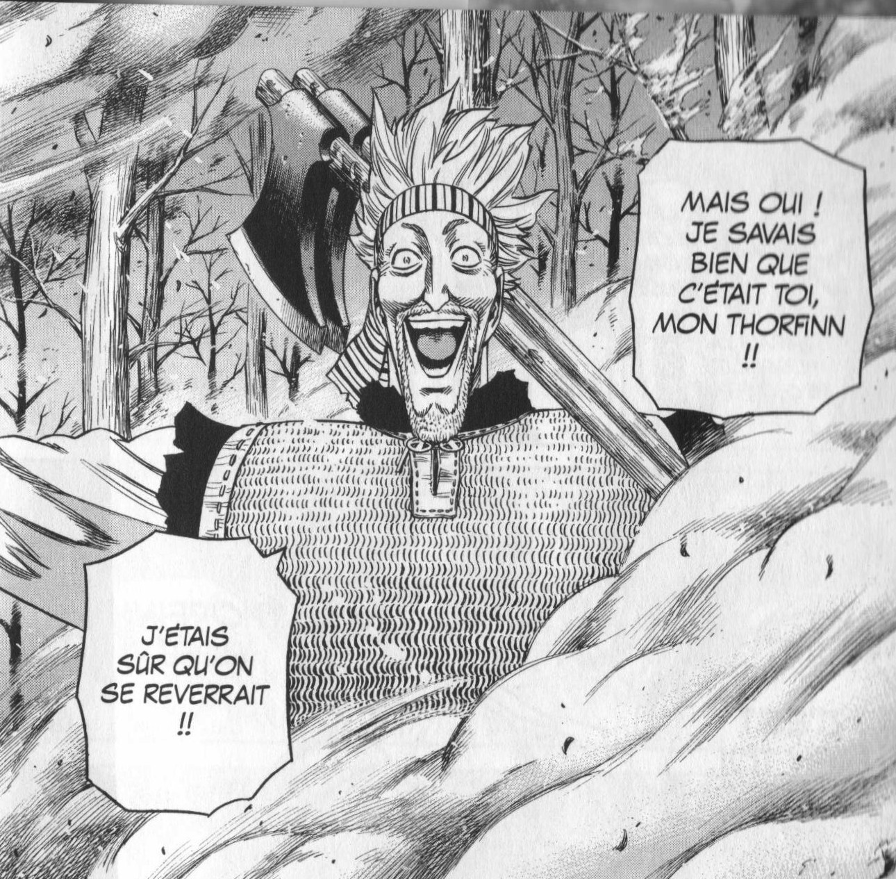L’impatience était au rendez-vous à la fin du tome précédent. Qu’allait-il se passer par la suite? Quelque chose me dit que ce sentiment va être présent à la suite de chaque lecture. Makoto Yukimura maîtrise grandement l’art de la narration. On tourne les pages sans jamais s’ennuyer, bien au contraire. Surtout que nous retrouvons notre trio gagnant avec Thorkell, Askeladd et notre chenapan adoré Thorfinn. Un petit nouveau pointe le bout de son nez afin de donner plus d’enjeux au récit. Le jeune prince Knut à l’aspect très féminin est au main des vikings et il tient à s’en servir à des fins politiques. Le mangaka pose dans cet épisode un cadre plus stratégique, historique et social. Les conflits influencent les frontières avec les rites culturels existants. On fait un arrêt sur un village avec des pratiques catholiques quotidiennes. Quand l’armée d’Askeladd, elle va éliminer tout le monde qu’importe les implorations et les références à leur croyance. Le curé enlevé tente à sa manière de faire du prosélytisme pour l’instant sans aboutissement. Mais sa présence est là pour autre chose. Car l’homme buvant comme un trou connaît Thors. Un lien qui aura une importance pour la suite.
