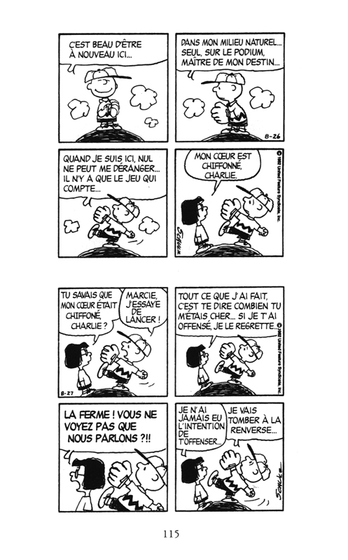 Pour beaucoup, les Peanuts font partie des lectures de leur enfance et qu’elles ont été oubliées en grandissant. Pour certains, c’étaient un moment quelconque et pour d’autre un moment phare plein d’humanité et de poésie. Umberto Eco fait parti de la deuxième catégorie et propose d’en faire une analyse très pointue et en profondeur. Cet expert de la sémiotique décortique toutes les situations pour en poser un regard constructif. On s’étonne de la quantité d’informations que l’on trouver dans juste un strip. Une vraie critique sociale sans demi-mesure se déroule sans nos yeux. Est-ce qu’un lecteur lambda peut-il voir autant de chose? Je crains que cela soit impossible. D’ailleurs même en commençant par la préface, c’est difficile de percevoir même en surface ces observations. Faut-il avoir un niveau de connaissances particulier pour porter une nouvelle lecture? Je crains qu’une formation en étude du langage avancée soit nécessaire. Pour l’instant, l’envie de prolonger la redécouverte n’est pas au rendez-vous.