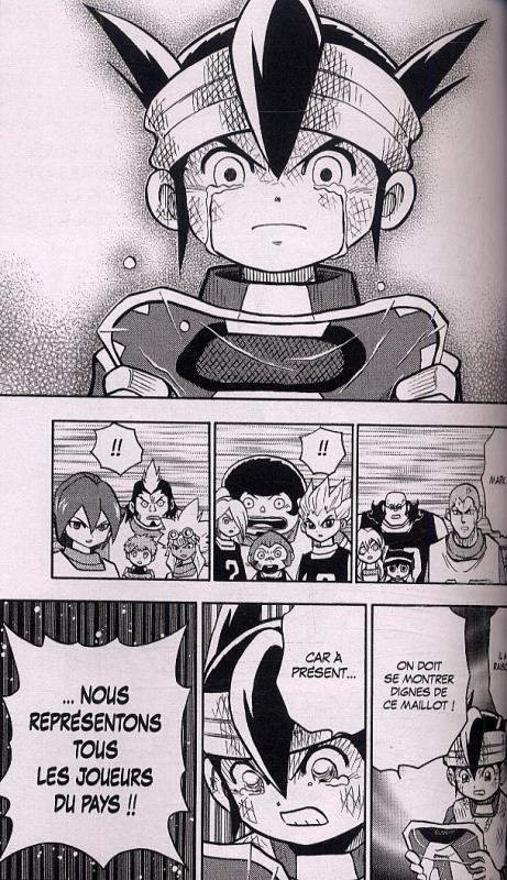 Sans aucune surprise, le collège Raimon remporte le Football Frontier. Par conséquent, les voilà qualifier pour participer à la sélection pour intégrer l’équipe qui va représenter le pays. Par contre, il n’y aura pas de place pour tout le monde. Il faut se démarquer en donnant le meilleur de soi. Bien entendu Mark Evans et les autres de son équipe sont pris. Pour mettre un élément dramatique, le petit Paul restera dans les gradins pour soutenir ses amis. On aura même le droit à une scène avec gros plan sur le visage d’un bambin les yeux en larmes. C’est la grosse scène d’émotions. Sinon pour le reste, Tenya Yabuno va vite en besogne, comme d’habitude. A peine sélectionnés, l’équipe toujours composée de garçons affronte un autre pays. Malgré un rebondissement improbable, les Inazuma Eleven gagne encore. On se lasse encore et toujours. L’avantage est qu’il ne faut pas très longtemps pour aller de la première à la dernière page. Et surtout, on n’espère plus rien d’étonnant pour les trois tomes restants. L’ennui profond vient surement aussi du fait que l’on soit adulte et que l’on a pu apprécier tellement de créations originales et travaillé. Quand on a 12/13 ans et que l’on est un adepte du ballon rond, on doit trouver un intérêt à ces platitudes. Après tout c’est presque plus palpitant qu’un match de foot à la télévision avec moins de culte de l’égo et de l’argent. Pour l’instant les mineurs apprécient de jouer ensemble et d’être considéré comme les plus forts.