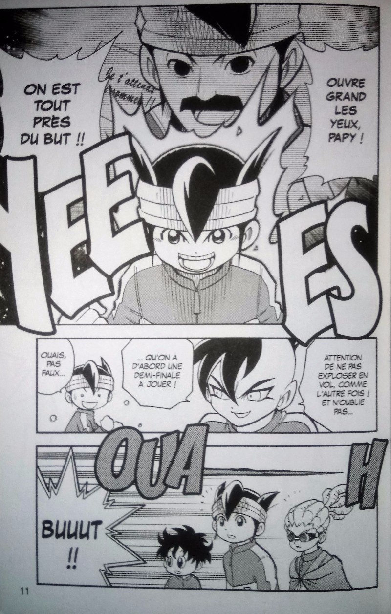 On le savait dès les premières pages ce qui nous attendait dans le tome 10. Plus les matchs avancent et plus les adversaires sont de haut niveau. Sans aucune surprise Mark et quelques autres de l’équipe se surpassent pour devenir toujours plus forts. En finale, le gentil goal découvre son papi. Il entraîne les meilleurs du monde et son petit-fils n’en fait pas partie. On s’interroge encore. Pourquoi le grand-père si inspirant s’est-il fait passé pour mort? Qu’elle est l’intérêt de ce rebondissement? Pourquoi a t’il changé de nom? Pourquoi a t’il choisi d’abandonner sa famille et ses amis? Juste pour former des joueurs mineurs? Cela n’a pas de sens. Et même quand les Inazuma Eleven gagne, il ne prend pas l’enfant dans ses bras. Aucune effusion, c’est comme si c’était quelque chose d’ordinaire. Est-ce que les matchs sont plus captivants qu’avant? Absolument pas. L’ennui se poursuit en tournant les pages. Mais une fois encore le manga s’adresse des enfants de 12/13 ans aimant le foot. Ils ont déjà vue et joué à l’univers des Inazuma Eleven. Pour les plus grand, c’est trop tard. L’innocence, les clichés, les inlassables répétitions, le culte de l’égo… deviennent trop lassant.