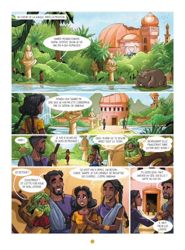 C’est toujours un vrai plaisir de retrouver la joie de vivre et la candeur d’Ayati. Malgré son jeune âge, elle a de lourdes responsabilités. De plus, elle doit faire des choix avec des conséquences importantes. Personne ne lui explique clairement les choses ce qui l’amène à de nombreux doutes. Mais être une représente de divinités sur Terre n’est-il pas un long chemin rempli d’incertitudes? Aucun doute que les jeunes lecteurs puissent faire le parallèle avec le flot d’indécisions et de scepticismes les touchant au quotidien. L’aspect mystique dans une autre culture n’est nullement un frein, bien au contraire. Car qu’importe où vous êtes, vous devez faire face à des obstacles et du mal-être. Et construire le récit en Inde en évoquant l’hindouisme est un choix toujours aussi audacieux. Ce monde est très rarement mis en avant dans le 9e art art et surtout à destination d’un public jeunesse. Pourtant quel régal de s’aventurer dans des méandres d’une grande richesse culturelle qui ne peut que titiller la curiosité. D’autant plus qu’il n’est jamais question de prosélytisme. On suit les péripéties avec intérêt et impatience car on ne sait jamais ce qui nous attend. Fabien Fernandez nous dresse toujours un scénario aux petits oignons. Le graphisme de Sandra Violeau et les couleurs d’Aurélien F. Kaori nous emportent dès la couverture vers cet ailleurs inconnu et plein de mystères. On a hâte de lire la suite.