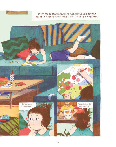 On ne pouvait rêver plus jolie conte mis en dessin pour parler de l’afflux des déchets qui abîment la nature. Et le fait mettre à niveau les encombrants en face des habitants, on se rend compte du nombre et de la gêne occasionnée. Cela détruit des maisons comme les catastrophes naturelles. Les individus sont en permanence en situation d’incertitude et de peur. Un géant est forcément méchant. On n’essaie pas de comprendre ce qui se déroule et on s’imagine le pire. Cela conduit à des situations très problématiques qui rappellent forcément la réalité. A trop simplifier, on vient à se tromper et à engendrer de la colère inutile. On confond causalité et corrélation. C’est percutant avec un regard critique très parlant. La beauté de la chose repose sur la délicatesse et la douceur dont c’est amené. Le dessin assez « enfantin » avec ces couleurs à l’impression manuelle apporte un souffle d’onirisme. On sourit à cette leçon de vie pleine d’humanité et d’espoir. Alors quand on referme l’ouvrage, on ressent un léger pincement au coeur de laisser cette famille aimante que l’on ne retrouvera pas.