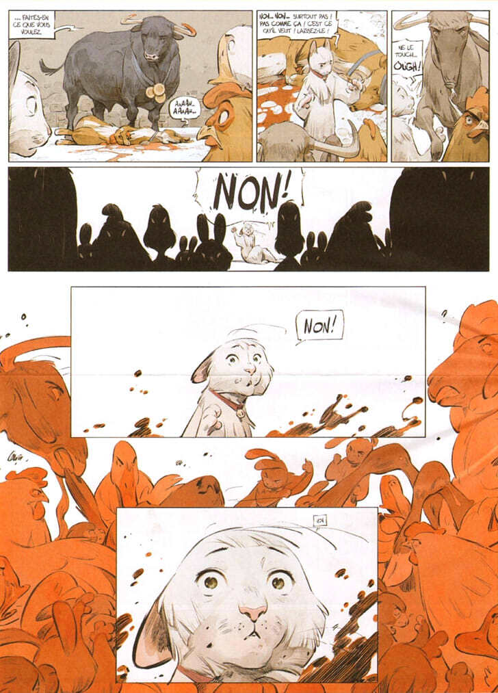 Xavier Dorison est vraiment un excellent scénariste. Il fait monter la pression d’un cran et nous pousse à réfléchir aux limites de la contestation. Vouloir se débarrasser d’un dictateur c’est bien toutefois que faut-il mettre à la place? Est-ce qu’une fois l’individu au poste de chef, il ne se transforme pas en être égocentrique? Le Président Silvio a chassé les cochons et le quotidien est toujours plus rude. Miss B écoute les conseils du rat Azélar pour mener à bien la révolte mais il n’oublie pas de la prévenir. Vouloir changer les choses pour plus d’égalité et d’équité c’est bien. La nature humaine a bien des travers et se laisse trop souvent dicter par la haine ainsi que la colère. Impossible de ne pas être touché par cette solidarité qui met en branle certes le système. Néanmoins, ils résistent à ne pas acheter le bois qu’ils vont chercher à grand peine. Impossible pour le pouvoir de les arrêter. Sous quel prétexte? Le froid glace leurs corps. Ils tiennent. Et quand on leur propose du bois à 50%, ils refusent. C’est gratuit ou rien. Comment ne pas perdre la face? La solution est simple. Donner au soulèvement un bouc émissaire sur lequel se défouler fera l’affaire à la populace. Le sang coule pour reprendre les choses comme avant, comme si rien ne s’était passé. Dorénavant, les autorités savent aussi qui est l’ennemi à abattre : Miss B.