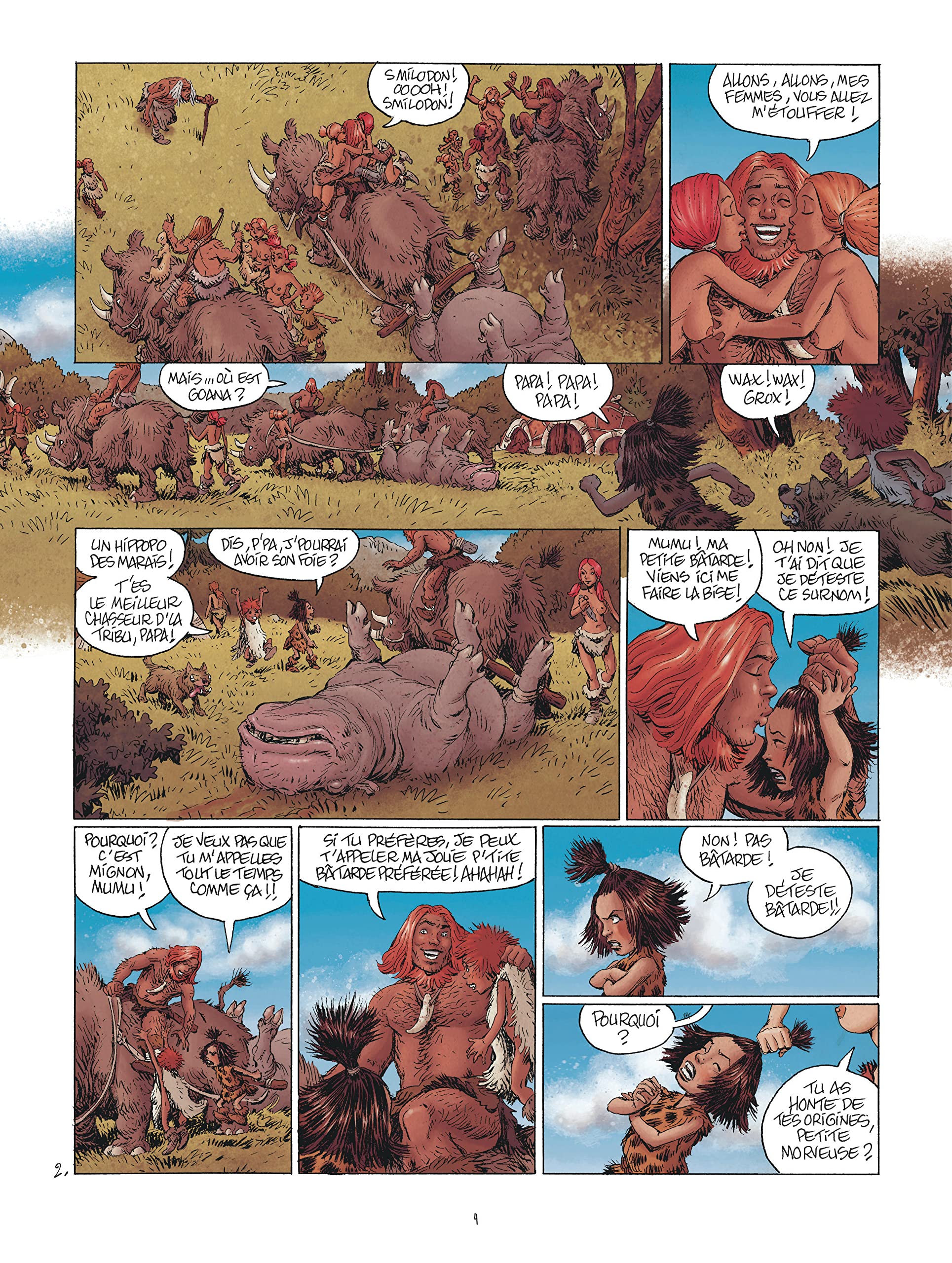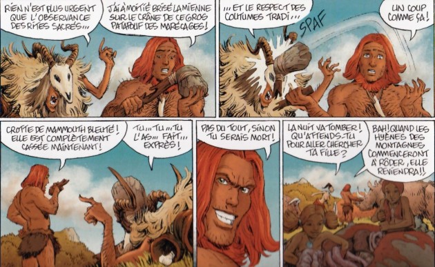 Dès les premières pages, on se demande comment Dupuis a t’il pu accepter de publier cette bande dessinée. Peut-être que le scénariste et le dessinateur voulaient faire un pastiche. Mais si c’est le cas, il faut le dire, c’est complètement rater. Déjà, choisir la Préhistoire est un peu la facilité surtout pour installer un gars qui dirige sa tribu. Quelle magnifique opportunité de mettre en avant les théories rétrogrades du 19e siècle écrites par des hommes pour des hommes. Pour justifier une société avec la supériorité du masculin, il faut prouver que cela a toujours été ainsi. D’un côté, ces messieurs qui chassent et de l’autre ces dames, soumises, crétines qui attendent avec impatience que leur protecteur rentre. Dorénavant, on sait que c’est totalement faux. Que dire quand on lit un ouvrage de 2019 qui rend la gloire au masculinarisme. Le boss est grand, fort et il faut qu’il satisfasse ces besoins. Donc on utilise l’argument que les gars ont des besoins sexuels forts ce qui justifie d’aller baiser à droite et à gauche. Les femmes sont des nounous, boniches et objets sexuels donc soit soumise et tais toi. Sans omettre, qu’elles sont possessives, jalouses et caractérielles. La cerise sur le gâteau, est la représentation extrêmement misogyne avec des corps très minces et des énormes poitrines, toujours à l’air et offertes au chef bien aimé. Le summum du dégoutant est la scène où la petite fille dit la bâtarde veut coucher avec père. Bien entendu, elle ne comprend pas ce fait son père avec tous ces clichés de porno. Néanmoins c’est très choquant. Elle dérange son père en pleine action et se dit : « J’pige pas pourquoi papa est toujours occupé à faire des câlins à toutes les filles de la horde! Il est trop gentil avec elles!! Et moi alors? Et pis à quoi ça sert d’avoir fait une petite fille rien qu’à lui, s’il passe tout son temps à jouer avec d’autres filles? Et pis d’abord, elles sont trop grandes pour ça ». En quoi la pédophilie est amusante? On pourrait continuer encore longtemps sur l’aspect navrant pour ne pas dire autre chose. La vraie satisfaction est que la suite prévue n’a pas été produite. Ce bouquin va finir à la poubelle et vraiment sa place n’est pas ailleurs.