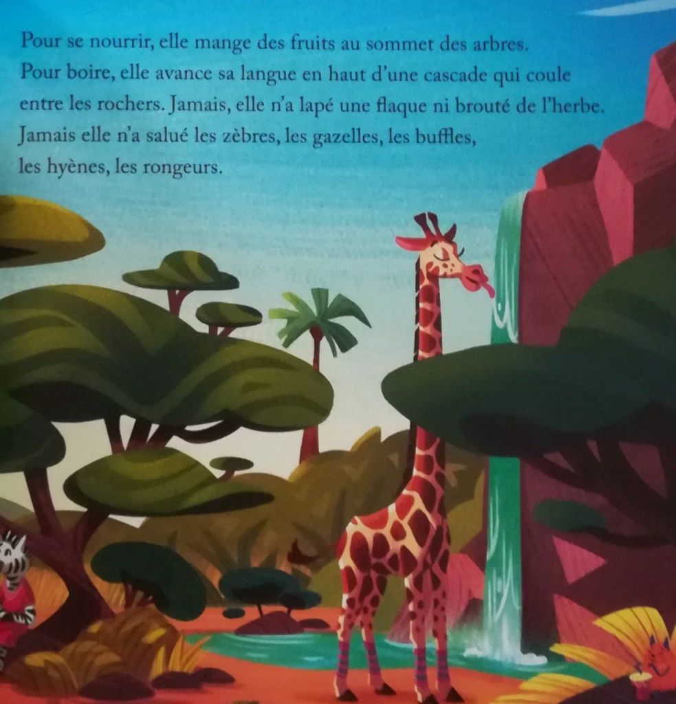 Eric-Emmanuel Schmitt est un conteur hors du commun. Depuis un temps certains, il propose des petites histoires pour les enfants à travers des animaux. Bien entendu, la finalité doit être toujours positive et pleine d’espoir. Là, le lecteur rencontre Pamela, une girafe qui a un grand coup. Tellement grand, que cela lui permet d’avoir accès à l’eau plus fraîche ou à une belle vision du ciel. Mais elle se sent seule car peu de personne passent au niveau de sa perception visuelle. Un jour, la voilà touchée par un torticolis ce qui l’oblige à avoir la tête au raz du sol. Qu’elle n’est pas sa surprise de découvrir une multitude d’animaux et en plus, ils veulent l’aider. A partir de ce moment, sa vie a totalement changer. Des problèmes peuvent naître des rencontres improbables. Comment ne pas trouver cela adorable et pleins de bonnes intentions? La différence n’est pas atout du rejet, bien au contraire. Qui ne rêverait pas que les bambins y croient vraiment et l’appliquent dans la réalité? Le graphisme de Florence Guittard apporte beaucoup de poésie et d’onirisme. Les formes rondes, des grands yeux, des sourires, une nature luxuriante favorise le réconfort et la bonne humeur. Afin de mieux s’approprier l’ouvrage, il faut trouver sur les doubles pages Pilou, un personnage orange et poilu. Aucun doute que l’univers saura séduire les jeunes.