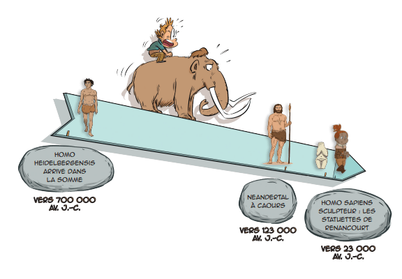 La sonnerie vient de retentir et Hagard est en retard. C’est une chance car devant l’école il rencontre son héros, Pascal Depaepe, archéologue à l’INRAP et spécialiste du paléolithique. Il est là pour une raison bien particulière : donner le nom des trois gagnants du concours de dessin « Moi à la préhistoire ». Les lauréats pourront enquêter sur les traces des premiers hommes dans la Somme, sur trois sites. Sans surprise, notre jeune héros n’a pas gagné mais il arrive à se faire inviter dans l’aventure. Impossible pour lui de ne pas céder au sommeil pendant le trajet. Qu’elle n’est pas son étonnement de se réveiller en 1863, à Moulin Quignon à Abbeville avec son chien. La pression est présente car un Jacques Boucher de Perthes cherche des traces d’un homme antédiluvien. Une quête audacieuse au vu de la pression de nombreux religieux qui limitent la création de l’humain à ce qui est écrit dans la Bible. Céline, la nièce du chercheur s’inquiète pour lui. Son bras droit, Rifard, ne semble pas très honnête. Peut-il garder un oeil sur lui? Pas le temps d’agir qu’une mandille est trouvée. Preuve irréfutable? Malheureusement non car l’appât du gain pousse des faussaires à agir. Il va avoir son lot de stupeur en partant dans d’autres périodes. Il n’aura pas le choix d’agir surtout un auroch lui foncera dessus. Ou quand un bébé mammouth voudra faire sa connaissance. Heureusement que des autochtones lui viennent en aide. D’autant plus en pleine glaciation car sa légère tenue ne lui permettrait pas de rester longtemps vivant. Grâce aux chevaux, ils peuvent survivre. Tout est utilisé, de la viande au tendon en passant par le crottin. « Ben dis donc, vous êtes écolos au Paléo… Zéro déchets ». On va de saisissement à des éblouissements sans jamais s’ennuyer, bien au contraire.