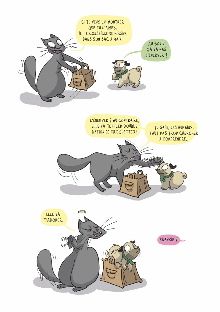 Il fallut un peu de temps pour trouver le juste équilibre de vie entre Pascal, Chantal et Michel, sans oublier les souris bien entendu. Voilà qu’un jour les maîtresses de la maison reviennent un autre petit être à quatre pattes. Comment ne pas sous le charme d’un bébé carlin? Si petit, si fragile et qui ressemble à une boule, on n’a envie de le câliner. Pascal n’apprécie pas du tout ce nouvel arrivant. Par conséquent, il va falloir agir vite et bien pour se débarrasser de l’intru. En effet, le chiot adore tout ce que déteste les chats. Mais cette non-acceptation se cache un grand enjeu d’équilibre géopolitique chats/humains. « Nous sommes les maîtres du monde, parce que nous avons le pouvoir de refuser les grattouilles! Si nous n’avons plus rien à refuser, nous ne sommes plus rien! ». Par conséquent, Pascal décide de reprendre le contrôle. Si on refile des puces au canidé, il est fort possible qu’on le dégage. Bien que cela soit un échec, il ne perd pas sa détermination pour autant. Et s’il faisait pipi dans le sac de course? Et si on le mettait dans la poubelle pour les éboueurs? Et si on le perdait dans la forêt? Le pire dans tout ça c’est que Frankie prend le chef de ces impostures pour sa maman. Par conséquent, il le comble de câlins et lui demande de jouer avec lui. Qui peut vraiment résister à cette masse de poil qui aboie?