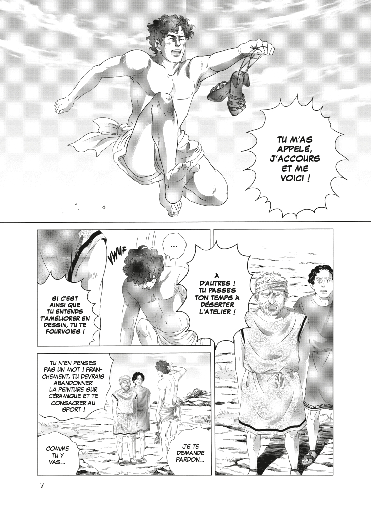 Il y a des hasards qui permettent de tomber sur des séries audacieuses. On se plonge dedans les yeux fermés et nous voilà projetées en Grèce antique. Nous voilà dans un petit village où l’on rencontre Démétrios. Il adore nager avec les dauphins et dessiner. On lui met la pression pour qu’il s’entraine en prévision des jeux Olympiques. Il n’en a pas envie d’entrer dans un principe de concurrence et de violence. En attendant, on lui demande de prendre des responsabilités importantes où l’avenir du village en dépend. Comment pourrait-il arriver, lui le poltron? Grâce à un ingénieux principe, le voilà projeté dans le futur au Japon. Par chance, à chaque fois il rencontre un japonais qui maîtrise sa langue. Ce voyage temporel rappelle une autre série « Thermae Romae ». Est-ce une copie d’un bon concept? Que neni. Mari Yamazaki est la mangaka des deux séries donc normal qu’elle a utilisé un principe audacieux. Rien de tel pour souligner une problématique et trouver une solution ailleurs. On peut se demander si c’est le passé qui a influencé le futur ou l’inverse. C’est une bonne manière aussi de comparer des pratiques, des usages et des rituels. Et aussi d’évoquer des faits historiques réels avec une approche originale et drôle. La lecture est passionnante de la première à la dernière page. Le côté assez drôle repose sur les hommes nus dont on ne voit jamais leur pénis. Il faut être fidèle mais pas trop non plus. C’est amusant.
