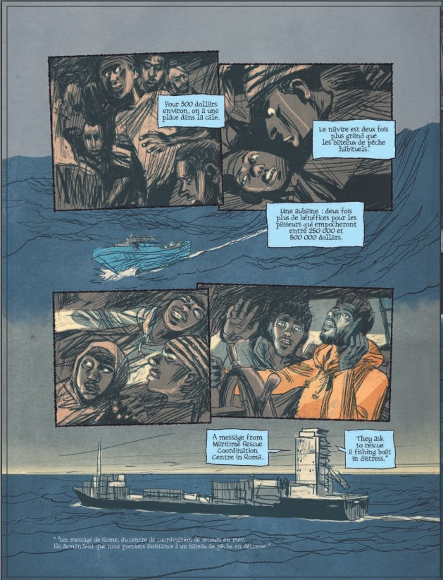 Malheureusement l’immigration est un sujet intemporel qui ne connaît jamais la crise. Les conflits armés, les dictatures, la violence, l’incitation à la haine, la grande pauvreté… poussent des citoyens du monde à fuir leur pays. Pour espérer vivre dans de meilleurs conditions, ils sont prêts à tout. Les passeurs profitent de la demande pour s’enrichir. Qu’importe les conditions de voyage, ils ne s’engagent à rien, même pas arriver en vie. Pour éviter les arrestations, ils mettent d’autres migrants comme conducteur de bateau. Ainsi s’ils se font arrêter, se sont eux qui iront en prison et non le commanditaire. Comment les arrêter? Comment faire pour collaborer avec un pays en guerre ou sans gouvernement fixe? De nombreux individus décédés, ils ne restent quelques prélèvements organiques, quelques biens personnels dans des boîtes conservées à l’institut médico-légal LABANOF, à l’université de Milan. Bien souvent, ils restent des inconnus qui finiront oubliés. Est-ce une fatalité? Taina Tervonen soutient et prouve que c’est un choix politique assumé et ce depuis les années 70. « C’est une aubaine pour l’industrie de la défense qui développe des outils de plus en plus sophistiqués pour surveiller les frontières » et ce même en Afrique. La scénariste affirme ces convictions avec détermination et des données. Par conséquent, ce n’est pas pour tout public. Pour donner vie à tout cela, Jeff Pourquié propose un travail proche d’un peintre. Il réalise des images très marquantes avec ces cadavres bien souvent au fond des mers. Cette approche apporte beaucoup de réalisme et d’humanisme. On se sent plus proche de ces personnes qui ne sont plus tellement des inconnus.