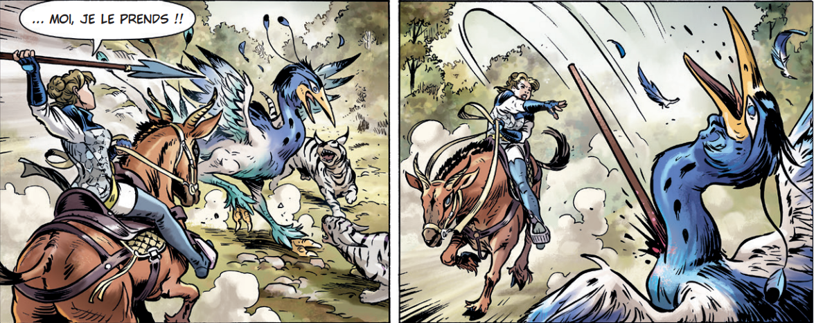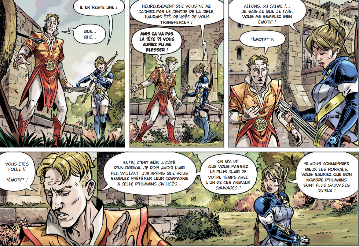 Les adeptes d’héroïc fantasy vont être ravis. Alexis Robin utilise tous les codes du genre en cultivant le mystère pour compléter ces trois tomes. Il peut compter sur Lucio Alberto Leoni et Emanuela Negrinpour pour retranscrire graphiquement son univers. On découvre une héroïne blonde, mince, avec des yeux verts. Bien entendu, elle a un corps de rêve. Pour une fois, elle n’est pas à moitié dénudée comme Cyann ou Pélisse. Rassurez-vous messieurs, les vêtements très moulants mettant en valeur sa taille fine, sa généreuse poitrine et son croupion rebondie. On y insère même un peu de pudeur avec certaines tenues qui couvrent l’entrejambe pour les hommes et les femmes. Ouf, nous ne verrons pas de gros plans sur le paquet. Mais ne passons pas à côté de l’information principale au coeur de l’action. A la fois guerrière et féminine, elle manie aussi bien les armes blanches que la harpe. C’est mignon tout plein. Seulement voilà, outre être sexy, elle est tellement capricieuse. Elle ne respecte même pas les règles de bienséance. Alors quand elle a une idée en tête, elle fonce directement. Pour mettre fin à la guerre qui s’annonce, elle décide d’aller tuer celui qui se réclame du trône. Encore une nana fonçant tête baissé dans les ennuis sans réfléchir. Par conséquent, il faut envoyer les meilleurs soldats pour la ramener. N’ayez crainte, il y a une intrigue là-dessous avec des liens familiaux inattendus, des pouvoirs, des bêtes étranges, des êtres avec trois yeux et des pustules… Nénamoins pour explorer cet aspect, il faut ménager votre patience.