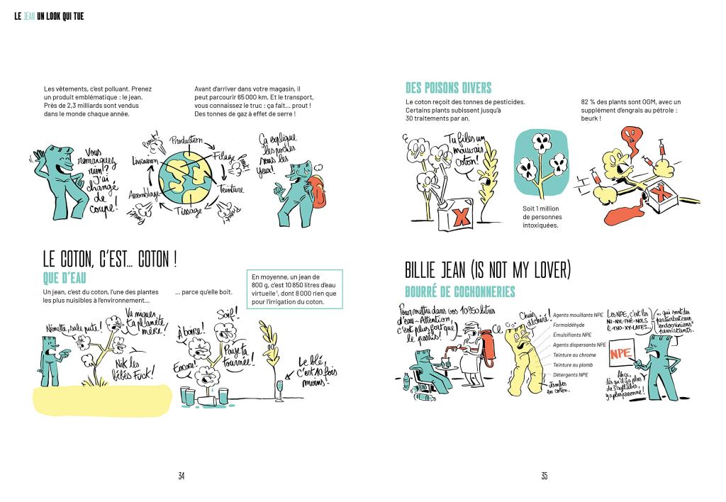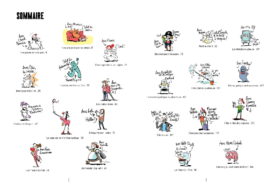 Eric La Blanche est très intéressé par la pollution surtout celle qui n’est pas visible. Il s’intéresse aussi bien aux couches pour bébés, le téléphone portable, l’élevage, l’eau, la gestion des cadavres… Les sujets sont très variés et concernent l’ensemble des citoyens. Mais cette diversité montre aussi que ces problèmes de déchets, d’exploitation, de résidus s’infiltrent autant dans l’air, le sol, l’eau… Tout à chacun est en lien avec ces consommables. Les petits chapitres, de 5/6 pages, permettent de donner l’essentiel des données. Que l’on soit néophyte ou non, on ressort avec une prise de conscience plus importante. Peut-on vraiment agir concrètement pour changer les choses? L’auteur donner les clés pour inciter les autres à percevoir autrement ce qui les entoure. Mais peut-on lutter contre le culte des apparences et la superficialité? Pour éviter juste d’avoir des quantités informations, Camille Besse apporte un peu de légèreté et d’humour avec ces dessins. C’est très utile car sinon on aurait juste quelques pages avec des bullets points. Il faut privilégier la lecture par à-coups pour digérer l’ensemble. Si vous souffrez de solastalgie, passez votre chemin. Pour les autres, gardez en tête les éléments pour devenir un spect’acteur.