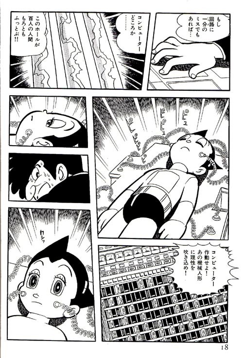 Le sujet principal est Astroboy, un robot enfant de haute technologie. Un scientifique fou de chagrin suite à la mort de son fils a créé un robot à son image. L’enfant ne grandissant pas, il le rejette aussitôt. On refourgue la machine à un gentil scientifique. Ainsi il prend le nom d’Astroboy et aide la police à faire régner le bien. Malgré ce que beaucoup ont écrit, Tezuka s’est toujours montré contre les nouvelles techniques. Le technosolutionnisme ce n’est pas son truc et le précise dans sa biographie. La bombe est une évolution avec des conséquences très radicales. les robots ne sont pas au goût de tous. Ainsi on rencontre un gang anti-robot, des droïdes au service des méchants, des automates en quête de propriétaires… Le mangaka construit même les rebellions. « Les membres portent tous un masque noir et nous ignorons qui ils sont vraiment. Il y a deux ans, c’est le centre de recherche en robotique d’Afrique du Sud qui a été réduit à néant. Il y a trois ans, la compagnie pétrolière des robots de Chicago… ». Au final, les gentils gagnent toujours qu’importe le prix à payer. Une lecture intense qu’il faut savourer progressivement car c’est très dense.
