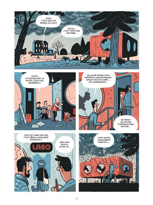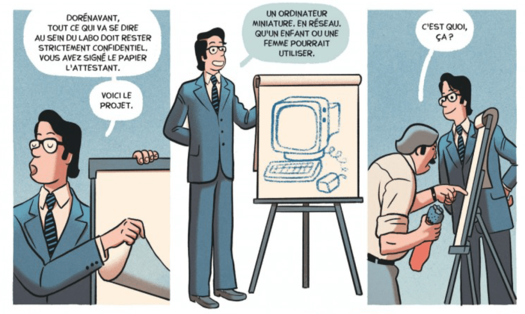 Très vite, on voit les références d’Hervé Bourhis dans son récit. On aurait pu croire que la France était une terre d’innovation dans les années 70, moments propices à proposer de nouvelles choses. En effet, à cette période les prémices de l’internet sont présents avec le projet Cyclades. Toutefois l’Etat a fait le choix malheureux du minitel. Le scénariste place son histoire en France, dans une zone reculée en Charente et dans un bâtiment singulier pour l’époque. L’entreprise de photocopieurs Bercop, leader du marché européen, cherche à se diversifier. Le patriarche, confie à son fils Jean-Louis, la direction du pôle R&D. Grâce à de la bonne marijuana, il voit l’avenir et cela sera l’ordinateur personnel. Grâce à une équipe d’hommes, les voilà qui créé une machine individuelle avec une interface, des outils et surtout un mulot (souris). Le tout peut-être relié à des imprimantes personnelles aussi.