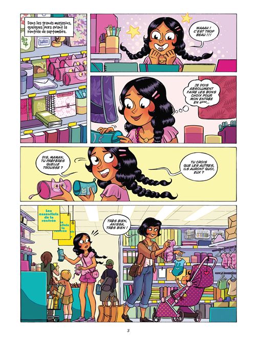 Le succès de « Mistinguette » n’est plus à démontrer. Pourquoi alors ne pas faire une autre série autour d’un personnage incontournable? Il ne faut pas oublier que certaines lectrices adorent ces filles cruelles et méchantes. Beaucoup doivent faire face à de telles chipies dans leurs établissements scolaires. Et ces adolescentes méchantes raffolent aussi pouvoir se retrouver dans un album qui leur est totalement consacré. Rien de plus normal que de retrouver Greg Tessier à la plume car c’est lui qui a conçu tout l’univers. L’approche est assez simple. Puisqu’Anissa se sent dénigré par ces parents, elle n’a pas d’autre alternative que d’être une diablesse pour se faire apprécier. C’est un choix possible, pas le seul. Pourtant, on ne sait pas pour l’instant si elle est sincèrement égoïste. N’oublions que c’est un âge assez difficile et au collège. La 6e est la classe la plus compliquée car il faut changer de rythme, on ne maîtrise pas tous les codes et qu’il y a des grands influents. Nous en saurons plus dans la suite car les parents vont devoir faire des choix par exemple sur le côté des finances. Du côté graphisme, on retrouve Amandine qui travaille aussi sur la série principale. Les formes sont arrondies avec des teintes chaleureuses et pétillantes. Par contre, ce qui étonne c’est la proposition d’écrire sur la bande dessinée pour faire des coloriages ou des quiz. Comme si l’objet livre était plus du niveau de celui d’un magazine. Les lectrices se laisseront-elles tenter? L’avenir nous le dira.