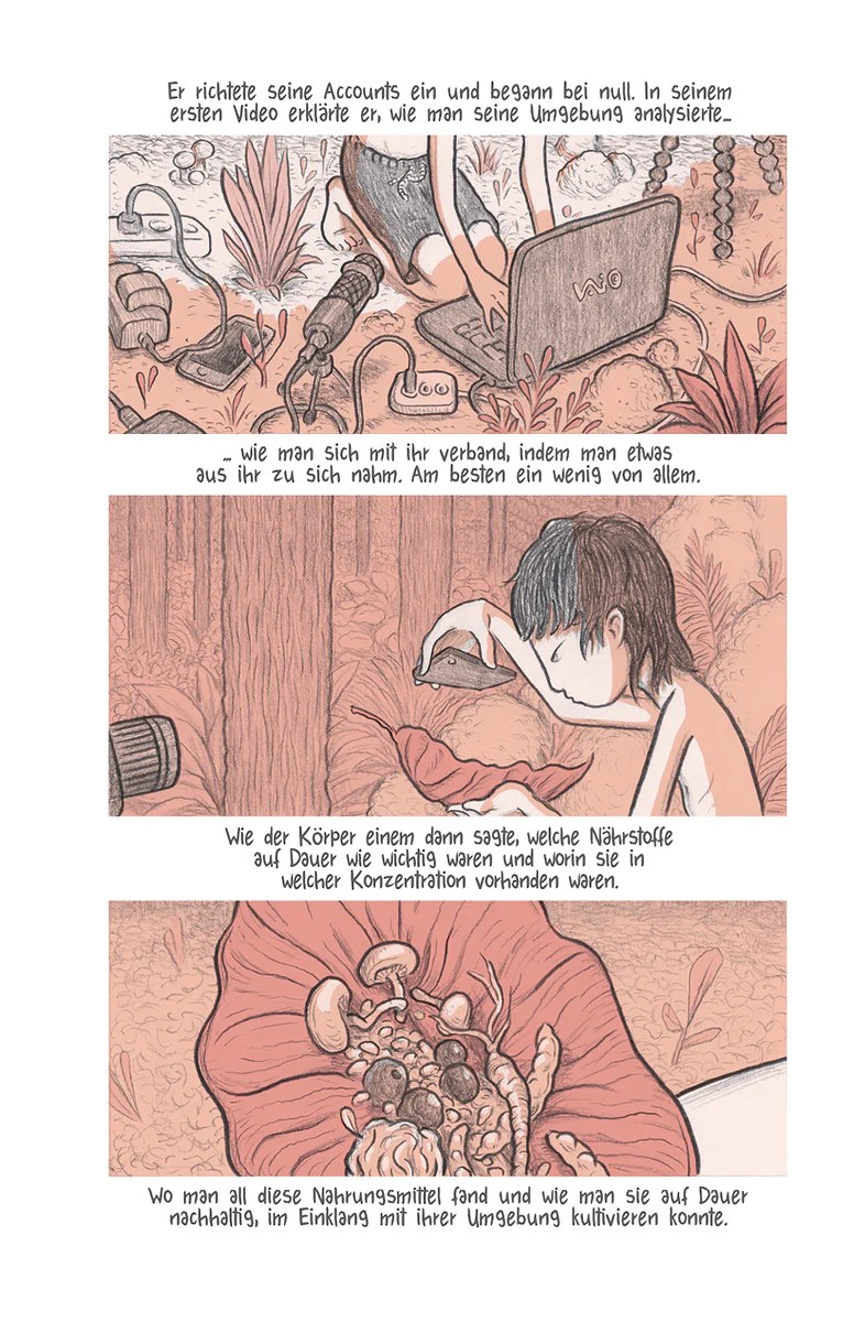 Lukas Juliger utilise tous les codes pour rendre l’histoire plus vraisemblable. Impossible de ne pas voir un parallèle avec notre société de consommation. Le personnage principal fait entendre sa voix en utilisant les réseaux sociaux et se fait soutenir par des influenceurs. Ses paroles infusent partout dans le monde. On se demande ce qu’il pouvait bien dire. La curiosité du lecteur est titillée. Nous verrons l’impact sur la population qui ira jusqu’à changer de vie en harmonie avec la nature. Et quand ils reçoivent le signal est lancé aucun n’hésite à suivre les consignes. S’il faut mourir pour redonner de l’essence à la Terre, personne ne considère cela comme un sacrifice. Ils participent tous à cycle qui améliora l’avenir sans trop de population. Un choix écologique dans l’air du temps et qui ne connaîtra jamais la crise. « Le phénomène ne fit que s’amplifier. Rares ceux qui n’avaient pas entendu parler de ce garçon mal coiffé qui prétendait vivre dans la forêt… qui expliquait comment estimer son empreinte carbone et vivre en économisant les ressources de la planète. Un garçon que les scientifiques qualifiaient de prodige et qui parlait aussi d’une extinction de masse sans précédent provoquée par l’Homme. De l’imminent écroulement de l’écosystème. De l’humain comme puissance géologique. » Une démarche très étrange et censé à la fois. Cela provoque une certaine gêne en tournant les pages car tout semble réaliste. Les dessins très précis et paisible contribue à donner de l’étrangeté à cette atmosphère. Surtout qu’il y a fait un choix de teintes douces avec ce rose, rouge et bleu. Rien de violent ou d’agressif, bien au contraire. Juste ce qu’il faut pour nous interroger et réfléchir à notre mode de vie.