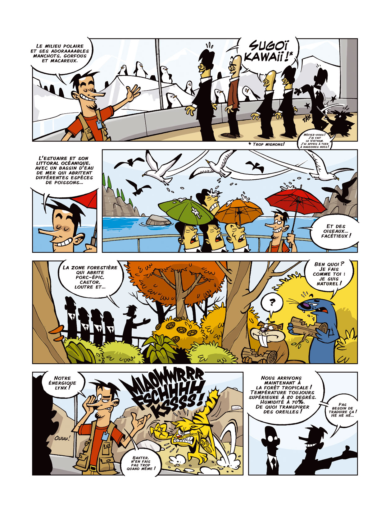 Frédéric Antoine pose comme cadre le changement climatique. A cause de cela, les animaux doivent être protégés. « Le biodôme représente cinq écosystèmes où la faune et la flore vivent dans leur milieu naturel. « Le milieu polaire et ses adoraaaables manchots ». « L’estuaire et son littoral océanique, avec un bassin d’eau de mer, qui abritent différentes espèces de poissons… « . « La zone forestière qui abrite un porc-épic ». » Pour plus de réalisme, il ajoute des informations précises. « Nous arrivons maintenant à la forêt tropicale! Température toujours supérieure à 20 degrés. Humidité à 70%. De quoi transpirer des oreilles ». Un peu de vraisemblance pour donner un peu de conscience à ce projet. D’ailleurs, l’équilibre financier est assez difficile à trouver et il faut chercher des subventions un peu partout. Par dessus, se rajoute des clins d’oeil à la culture populaire comme Igor et Grishka. Un mélange qui surfe sur un sujet dans l’air du temps. Toutefois, cela ne suffit pas à faire de l’humour drôle. En effet, la motivation n’est pas là pour poursuivre la découverte.