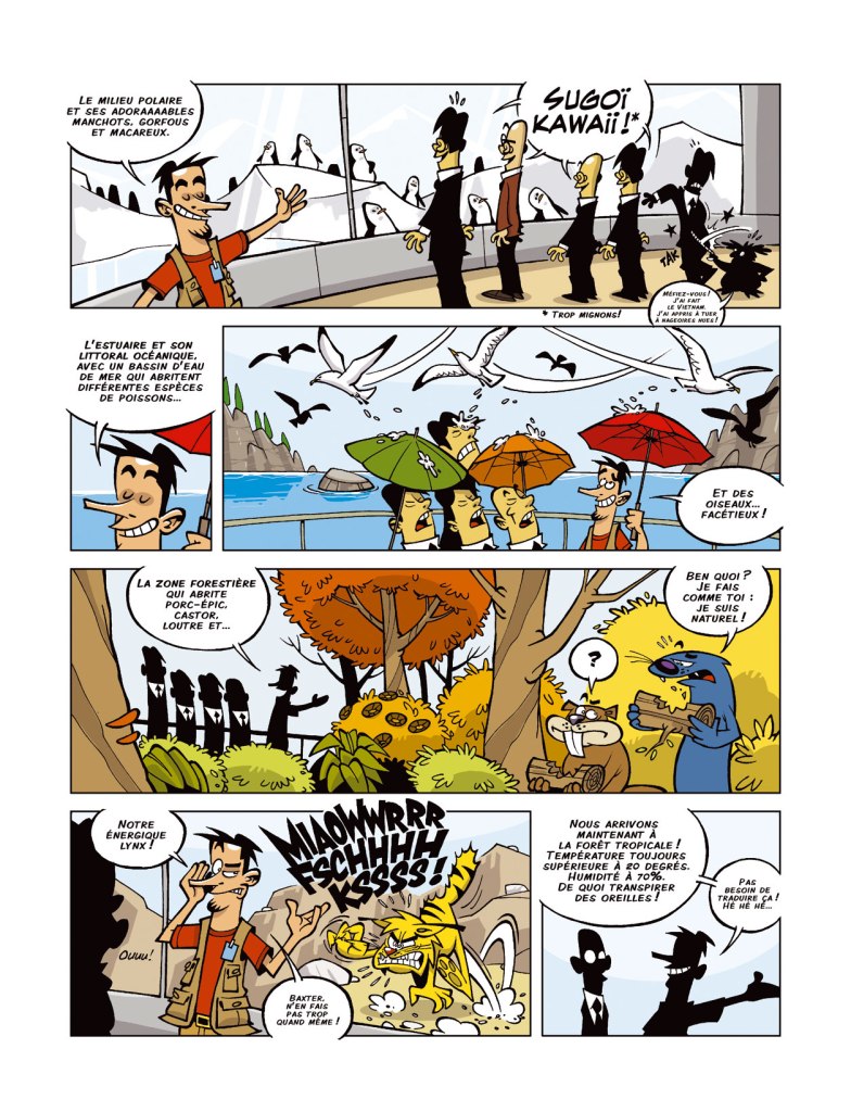 Il y a toujours quelque chose de dérangeant de voir de l’anthropomorphisme avec des humains. Pourquoi des animaux devraient marcher sur deux pieds comme les humains et agir comme eux? Surtout pour faire rire, ils devraient se comporter comme des adolescents? Même si nous sommes dans un zoo, les blagues sont attendues et déjà lues. Il est bien rare d’être pris au dépourvu ce qui peut être surprenant pour une série comique. Le succès est en plus au rendez-vous car il existe 5 tomes. On s’interroge sur le choix de changer le titre de Biozone en Biodôme. Est-ce une façon de faire découvrir la série à de nouveaux lecteurs?