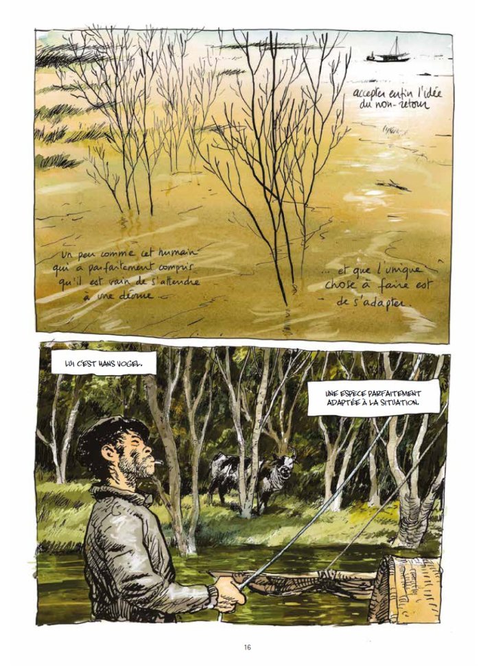 L’ambiance étrange est surtout du à trois éléments. Le premier est l’univers graphique assez particulier. Un dessin à la fois précis et lisible dans une forme de nuage d’aquarelles. On y voit le style d’un carnet de voyage. Le bédéaste est aussi un adepte du genre. On apprécie d’admirer des pages entières où on peut admirer des nuances comme le bleu. Puis le choix d’écriture avec cette police manuscrite qui apparaît à la fois dans des bulles et sur les images. Une façon d’immerger un peu plus le lecteur. Et enfin, le style assez poétique et réaliste à la fois. L’orientation environnementale est un engagement fort. D’autant plus que nous sommes en France, une zone inondable. Est-ce si improbable? Il pose des questions sur les causes de cette catastrophe naturel. L’humain n’est pas en reste. C’est lui le catalyseur avec la pollution, la consommation, la destruction de la biodiversité… Une oeuvre étrange, mystérieuse et entêtante. On reste sur une non-fin, mais doit-il en avoir une? Et il semblerait que cela soit un premier tome d’un duo. On restera vigilant sur ce point.