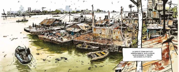Nous sommes en France, l’eau est montée et il n’y aura pas de décrue. Face à ce nouveau phénomène, beaucoup de populations sont déplacées et survivent comme elles peuvent sur les terres émergées ou apprennent « à flotter ». Les grandes villes, comme les grands pôles industriels, sont, quant à eux, systématiquement entourés de digues et soumis à des normes sanitaires. Face à l’insalubrité potentielle de ces modes de vie « hors des digues » et au danger qu’ils représentent, les autorités invitent ces populations à venir rejoindre au plus vite les centres d’hébergement d’urgence construits à la chaîne, sous peine de perdre certains de leurs droits citoyens. Une famille, qui a vu son habitat noyé par la montée des eaux, refuse d’obéir à l’injonction gouvernementale. Ils vivent sur une maison flottante. Jeannes, la mère, préfère cette liberté. Jeanne a deux fils, Hans et Groza, et un chien médium. Groza, un ancien CRS, traumatisé par son passé, ne parle plus que par onomatopées et a développé l’étrange manie de vouloir régler tous les problèmes. Hans vit une séparation douloureuse avec la mère de sa fille Vinee. Ils cherchent un lieu émergé où ils pourront vivre en paix, et sont prêts à lutter contre la nature déchaînée mais aussi contre les hommes, capables des pires bassesses pour survivre à ce monde en mutation. Un récit d’anticipation aux préoccupations très actuelles et personnelles, dont les deux tomes nous mènent dans des Pays de la Loire noyés par la montée des eaux.
