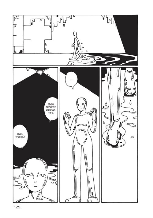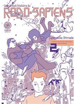 Mais l’histoire la plus touchante repose sur un couple de robots qui fondent une famille. Comme ils n’ont pas pu arriver à réussir leur mission, ils ont réalisé l’autre tâche : être heureux. Ce n’est pas si facile à définir surtout quand tout repose sur des données informatiques. A deux, ils trouvent la solution en faisant un enfant qu’ils éduquent avec patience et amour. Le dessin épuré apporte beaucoup de force et de densité. Toranosuke Shimada ne se préoccupe pas des détails qui n’apporte rien. Des traits nets et du remplissage en aplat, pour jouer ainsi avec le noir et blanc. C’est très graphique. Un dessin moderne très éloigné des publications habituelles de type « Naruto » ou « Dragon Ball ». Cette deuxième lecture permet de prendre conscience qu’il vaut mieux lire l’intégrale que les deux tomes séparés. Comme on trouve une continuité, l’impression de rupture n’existerait pas. N’oublions pas que cela se lit assez rapidement donc même si c’est épais et lourd, cela n’est guère gênant. Une lecture au final singulière et sympathique qui incite à découvrir le manga moderne.