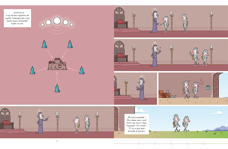 On oublie souvent la force d’une histoire sans texte. Nous sommes très loin de « The little Nemo in Slumberland » il fallait expliquer l’image et le texte de la bulle. On suit deux personnages qui vont d’un point A à B, puis C, puis D… pour installer des machines afin de permettre de créer de l’énergie au service d’une ville. Malgré quelques imprévus, ils mènent à bien leur mission. Un des gars va même rencontrer l’amour qu’il ne pourra bien entendu par approfondir. L’objectif a atteindre avant tout. C’est assez mignon et drôle. Pour dynamiser son récit, Max Saladrigas joue astucieusement avec les nuances de couleurs assez complémentaires avec le bleu, vert et mauve. Il trouve le juste rythme pour y donner plus de mystère et d’intrigue. Il s’amuse à intégrer aussi des formes et les mettre en interaction. Ainsi par exemple, on voit un arbre qui s’anime pour donner un coup de main quand quelqu’un joue de la flute. On garde le sourire tout au long de la lecture. En plus, nous avons le droit à un adorable happy end. Un ouvrage qui plaira autant aux enfants à partir de 8/9 ans qu’aux adultes.