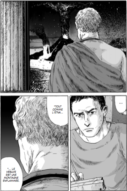 On rencontre Pline et sa curiosité pour tous les éléments naturels. On s’amuse de voir les croyances comme quoi c’est Jupiter qui envoie des éclairs du ciel. Mais l’homme se refuse de croire cela. Grâce à son observation et des échanges, ils proposent d’autres théories plus réalistes. On voit rétrospectivement l’évolution de la pensée et du rapport au monde avec l’évolution des connaissances. Même aujourd’hui, il est reconnu pour son ouvrage « Histoire naturelle » qui analyse finement aussi bien la nature, la géographie, les mouvements de la mer… Cet enthousiasme se retrouve dans ce premier tome où l’on est confronté au Vésuve réveillé, crachant bien des cailloux. Mais l’on va faire aussi un voyage temporel quand il était plus jeune et qu’il prend à son service un jeune scribe, Euclès, afin qu’il note tout ce qu’il dit. L’autre personnage important n’est d’autre que l’empereur Neron. Un individu capricieux, lunatique et violent. Il a tué sa mère et se sent hanté par son fantôme. Sa maîtresse l’a incité à répugner son épouse pour qu’elle puisse prendre sa place. Par conséquent, il n’est pas bon de se mettre une telle personne contre soi. Pline n’a guère d’autre choix que d’aller lui rendre visite pour assister à un concert. C’est mal vu de refuser inlassablement. Sa vie et celles de ces proches sont en jeu. Ce qui ne l’empêche guerre de prendre son temps et de profiter de bonnes choses comme des thermes. Un élément récurent dans l’oeuvre de la mangaka et qui appartient aussi bien à la culture italienne que japonaise.