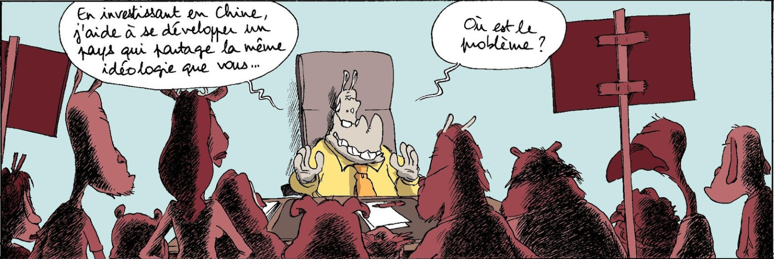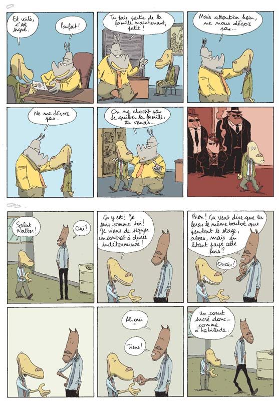 James ne manque décidément pas d’idées pour porter un regard critique sur le monde impitoyable de l’entreprise. Heureusement que la structure fictive fabrique des sous-vêtements car on pourrait trouver que toute ressemblance avec la réalité serait fortuite. Il aborde avec dérision les personnes surdiplômées qui ont des postes comme assistant avec le salaire qui va avec, le harcèlement, l’humiliation gratuite… Sans omettre de stratégies de manipulation comme le boss qui met une petite chaise fragile pour créer l’inconfort chez les collaborateurs pour le déstabiliser et qu’il ne puisse arriver à formuler ces requêtes/problèmes. Et comment optimiser les choses quand internet déconne? Les salariés sont totalement dépendant de la connexion. Impossible d’être productif et rentable par conséquent. Tout passe par le numérique ce qui montre une dépendance à cette nouvelle technologie et les frustrations que cela peut engendrer. Une autre thématique commence a être abordé avec la délocalisation. Tout coûte moins cher en Chine, comment rivaliser? La production est déjà faîte en Chine, en Tunisie, en Inde… Jusqu’où cela peut aller? Aucun doute que le scénariste aborde ce sujet dans les deux autres tomes de la série consacré au travail. Il donne à rire d’une réalité bien trop vrai et qui ne fait plus rêver. Faut-il être alors devenir juste une bête et être dévoré ou se faire dévorer? La représentation anthropomorphique laisse au lecteur le choix de trouver la réponse qui lui convient le mieux.