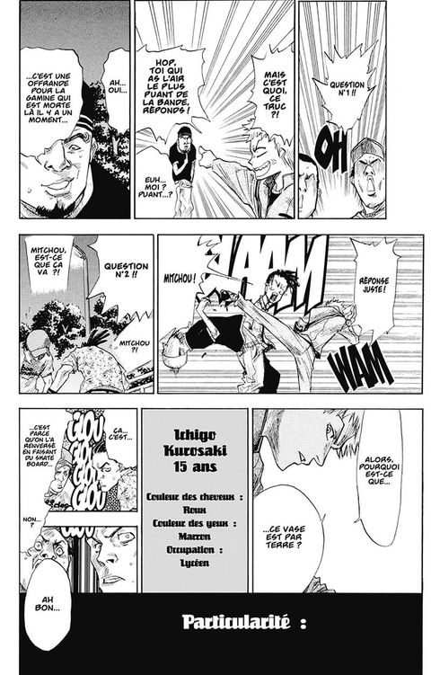 Ichigo Kurosaki aide la shinigami le temps de sa convalescence. Par conséquent, il doit se former progressivement. Les esprits maléfiques sont gigantesques et sans pitié. Par conséquent, il ne faut pas hésiter à couper la tête et de dos. Pourquoi? Pour éviter de voir sa tête et la trace de l’humain qu’il était auparavant. Et oui, ce n’est pas tout simplement des monstres qui apparaissent sans raison. C’est pour ça qu’il tue presque toujours en premier les membres de leur famille, leurs proches et leurs amis. On apprend les bases à partir d’une vingtaine de pages avec d’une part les gentils fantômes qui sont les plus courants. Le but est de les accompagner vers la soul society. Et d’autre part, les esprits méchants, les hollows qu’il faut éradiquer tout simplement.