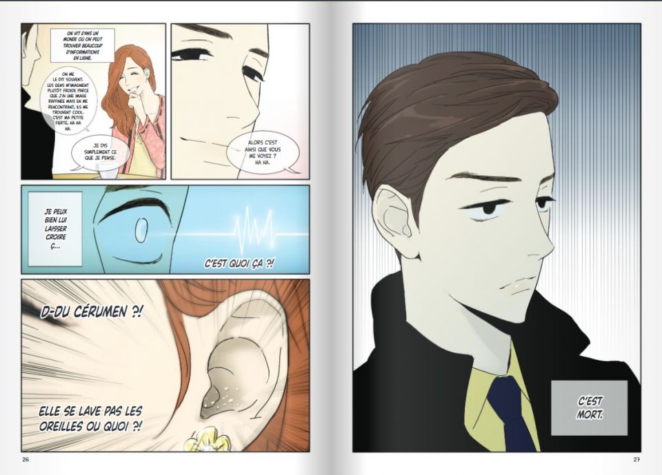 Les webtoons arrivent à se faire une place en France aussi sur les plateformes numériques qu’en impression papier. Même si lorsqu’on emprunte l’ouvrage on n’a pas fait attention, cela saute aux yeux dès la première page que nous sommes dans un manhwa pour téléphone portable. On a le droit à un dessin simplifié, pas de décor chargé, pas trop de texte, des gros plans sur les visages, des couleurs en aplat… Bref, tous les codes sont bien respectés. On sait que nous sommes en Corée grâce aux noms des personnages Seon-Gyeol qui ne sonnent pas très japonais. Les adeptes des dramas y sont habitués. Netflix en propose plus que de raison.