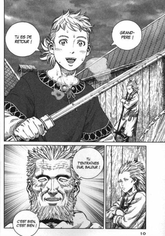 Une nouvelle fois Makoto Yukimura nous sert un scénario aux petits oignons. Le mangaka sait toujours quand il faut insérer de nouveaux rebondissements riches en émotions. Thorfinn découvre qui est vraiment le meurtrier de son père et ne doit pas agir. C’est à l’encontre de sa décision et Hild veille à ces actions. Voilà qu’un super vilain débarque avec Garm. Floki lui a donné l’ordre de le tuer. Comment gérer ce tueur qui n’a aucune éthique et qui a une soif de mort? D’autant plus qu’il possède une technique très particulière et précise. Nous avons eu le droit à une mise en bouche avec un combat très bien scénarisé. Juste assez pour nous donner envie de retrouver un affrontement haut en couleur par la suite. Son physique n’est pas très loin d’une caricature de super-saiya dans « Dragon Ball ». Cette force s’oppose à Baldur, un pré-adolescent censé diriger les terribles jomsvikings. Papi Floki veille mais jusqu’à quand?