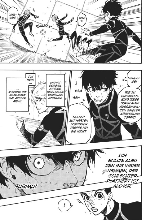 La ligne directrice de ce manga est d’apprendre à des ados à devenir de pur égoïste. Ils doivent apprendre à écraser, mépriser, manipuler les autres pour arriver à son objectif. Si sur le terrain vous avez la chance de faire gagner votre équipe en faisant une passe, vous ne le faîtes pas. Juste vous compte et les autres c’est de la merde. Un message assez étrange à entendre. Muneyuki Kaneshiro justifie même cette pensée en citant des grands noms du foot comme Cantona ou Pelé. Il ne précise pas le contexte afin que l’on puisse vérifier la véracité. Mais sont-ils tous des mégalos? Faut-il se croire le roi du monde pour être bon? On revendique l’égocentrisme à tout va. Cela à de quoi dérouter. Comme l’ouvrage se dirige vers un public adolescent, il est possible que se reconnaisse plus dans cette démarche. Même si le public adulte a été aussi très conquis semble t’il. On verra par la suite s’il y aura un peu de nuance au principe qu’à la fin il n’en restera qu’un.