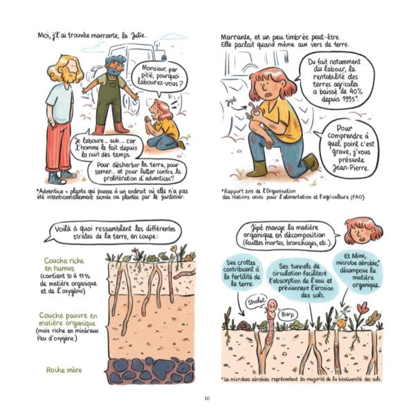 Quand on voit une nouvelle publication de la collection Mâtin!, on se précipite dessus. Quel régal ces albums qui parlent aussi bien de féminisme, du plastique que de contraception masculine avec humour, sérieux, pédagogie et espièglerie. C’est rare de trouver tout ça dans des albums bd et sur un choix éditorial qui se veut exigeant. Comment ne pas tomber sous le charme quand on lit le titre « Petites leçons de permaculture, avec deux individus attachants distribuant de l’amour à la nature. Surtout que l’on y observe de plus prêt, sur la couverture, des personnages essentiels avec une adorable cocotte, un vers de terre gourmand et gourmet, une coccinelle, des papillons et des abeilles. La référence du 9e art sur le sujet était « Permacomix » de Cécile Barnéoud et Guizou. On suivait un couple qui se rendait dans des lieux pour découvrir différentes façons de penser leur rapport à la terre, l’énergie, la nourriture… Alexandra Garibal et Audrey Lainé se concentrent uniquement sur le jardin et c’est déjà d’une très grande richesse. Le principe ludique de quelques planches et quelques pages d’explications plus poussés fonctionnent dans un parfait équilibre. En plus, il y a un vrai effort de vulgarisation et de transmission. On ne le lit pas une seule fois. On prend son temps. On relit, on surligne, on colle des marques pages. Sans oublier que l’on s’amuse et que l’on rigole. On tombe sous le charme incroyable de Jipé le vers de terre. Voilà un super héros qui n’est pas souvent mis en avant. Impossible de ne pas apprendre des quantités de choses que l’on soit un adepte de Nicolas le jardinier ou non. Connaissons-nous l’usage de la grelinette? Savons-nous comment sont structurés les matières organiques dans le sol? Pourrions-nous parler facilement de lombriculture? Les lecteurs ont su identifier la qualité lors de sa prépublication sur l’Instagram de Mâtin! avec plus de 100 000 vues. Dorénavant, on peut avoir un ouvrage complet à mettre bien évidemment dans sa bibliothèque personnelle et à conseiller ainsi qu’à offrir. C’est à nous maintenant de semer les graines des bonnes pratiques.