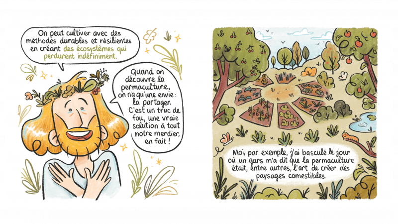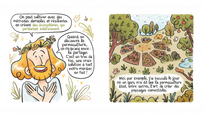 Julie, biologiste et militante écologiste rencontre Philibert, permaculteur, un jour pas comme un autre. La dame interpelle un agriculteur dans son champ : « Monsieur, par pitié, pourquoi labourez-vous? ». La réponse l’a déstabilise un peu. « Je laboure… euh…. car l’homme le fait depuis la nuit des temps. » Bien entendu, on voit le raisonnement. Toutefois, ce qui se pratiquait il y a plus de 50 ans ne se justifie plus forcément de nos jours. La culture a changé. On ne peut pas tout simplement dire que c’est du grand n’importe quoi. Cela mérite quelques explications, données avec le sourire bien entendu. En effet, cela réduit la productivité pour une raison assez simple, on étouffe le sol. On ne va pas s’attarder non plus sur les champs de monoculture à perte de vue. Avant de parler plus amplement de la permaculture, on la définit un peu. Le terme apparaît dans les années 1970 en Australie suite au combo sécheresse et grosse chaleur. Bill Molison et David Holmgren se fondent sur les bases posées plusieurs années plus tôt par le Japonais Masanobu Fukuoka. « Elle s’inspire de la nature pour développer des écosystèmes résilients, stables et durables. En résumé, la nature étant sacrément bien faites, autant la copier ». Et ce n’est pas si compliqué que cela à saisir et pour être certains de bien assimiler, il suffit de regarder/lire ce que font quelques références du milieu. Par la suite vient l’étape la plus difficile qui est de se lancer dans l’aventure. Elle sera composée de doute, d’échecs, d’énervement, de plaisir et de satisfaction. Il y a des solutions qui sont propres à certains types de sol, à certains climats, à certaines orientations sud/nord… Par contre, on n’évite de faire n’importe quoi, n’importe comment et n’importe quand. Il y a des règles à respecter selon les saisons comme le rythme des plantes. Ne pas oublier de comprendre comment fonctionne la terre pour mieux la nourrir et l’aider. Par exemple, vous croyez que la limasse et son copain l’escargot sont vos pires ennemis? Et s’il fallait changer son regard et considérer qu’il n’existe pas vraiment de nuisible. Il faut apprendre la coopération entre humains qu’importe sa taille et sa passion culinaire. Donc, essayez, trompez-vous, rester patient, observer, écouter, déguster et savourer l’émerveillement face à la beauté du monde.