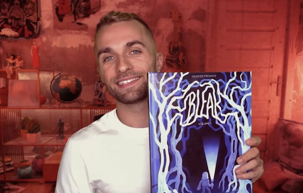 Le premier tome n’était ni très envoûtant ni très mémorable. Pourtant on se lance dans la lecture du second tome car un niveau m’en a fait la commande. Lui a été totalement conquis au point d’en revouloir encore. Est-ce du à la fracture générationnelle? Déjà voir Squeezie en tête de la couverture ne me parlait pas. En effet, le youtubeur qui parle de jeux vidéos cible un public particulier. Le gars a su mettre plusieurs cordes à son arc pour vivre confortablement de son travail autour d’activités de loisirs. Il a même sa sculpture au musée Grévin, c’est pour dire. Mais l’homme n’est pas scénariste tout comme Swan & Néo, Cyprien ou Frigiel. Guillaume Natas et Théodore Bonnet font une grande partie du boulot pour inventer trois histoires d’horreur. Mais assez vite, on se rend compte qu’il n’y a pas grande imagination derrière ça. On a déjà vu ou lu ces approches. Donc le suspens n’est pas vraiment au rendez-vous car on devine assez vite ce qui va se dérouler, parfois à la deuxième case. De toute façon, les histoires sont très courtes donc pas le temps de faire monter la pression.