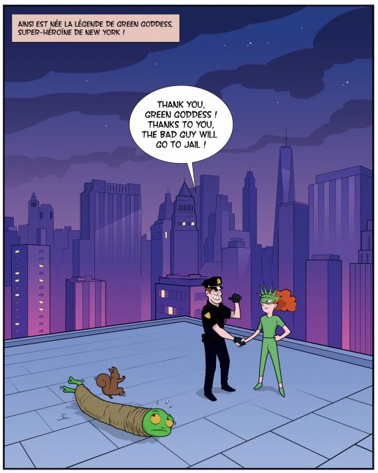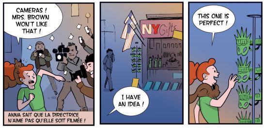 Apprendre une langue est bien souvent difficile pour les plus jeunes. Mais une bande dessinée bilingue est un excellent outil pour les inciter à apprendre dans la bonne humeur. On découvre Anna qui travaille dans un cirque est d’une grande souplesse. Rien de tel pour permettre de courir après un voleur. Elle prend le masque de la statut de la liberté ce qui lui vaut le surnom de Green Goddess. A partir de là, elle devient une héroïne qui poursuit deux méchants dont un habillé en grenouille et l’autre en magicien. Ils s’allieront même avec des adolescents vulgaires et malpolis. La demoiselle leur a appris les bonnes manières comme ne pas jeter dans la nature ces déchets. Grâce à sa dextérité et son écureuil domestique, elle aide la police.