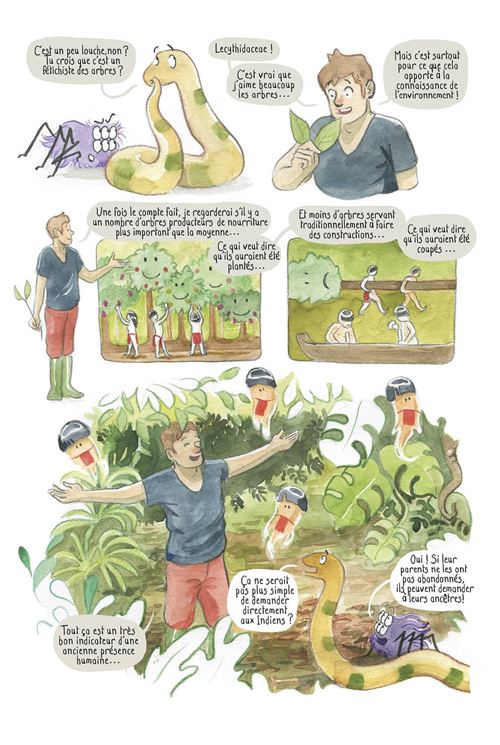 Cette forêt n’est pas primaire comme on aurait pu le croire. Des Hommes l’ont façonné ce qui lui a permis d’avoir aussi cette grande biodiversité. L’Amazonie comprend 390 milliards d’arbres répartis en 16 000 espèces différentes. C’est très intéressant d’apprendre et d’appréhender une autre réalité de société. On tourne les pages en accumulant de nouveaux savoirs. On s’émerveille de la force de la nature et de la coopération avec l’homme. Le dessin est très précis et réaliste avec des couleurs assez douces et pales. La créatrice trouve le juste milieu entre la vraie aventure scientifique, la force de la nature, la coopération entre individus, l’entraide, l’impact de l’humain sur l’environnement… Une bande dessinée qui permet vraiment de comprendre l’intérêt de la recherche et de la transdisciplinarité.
